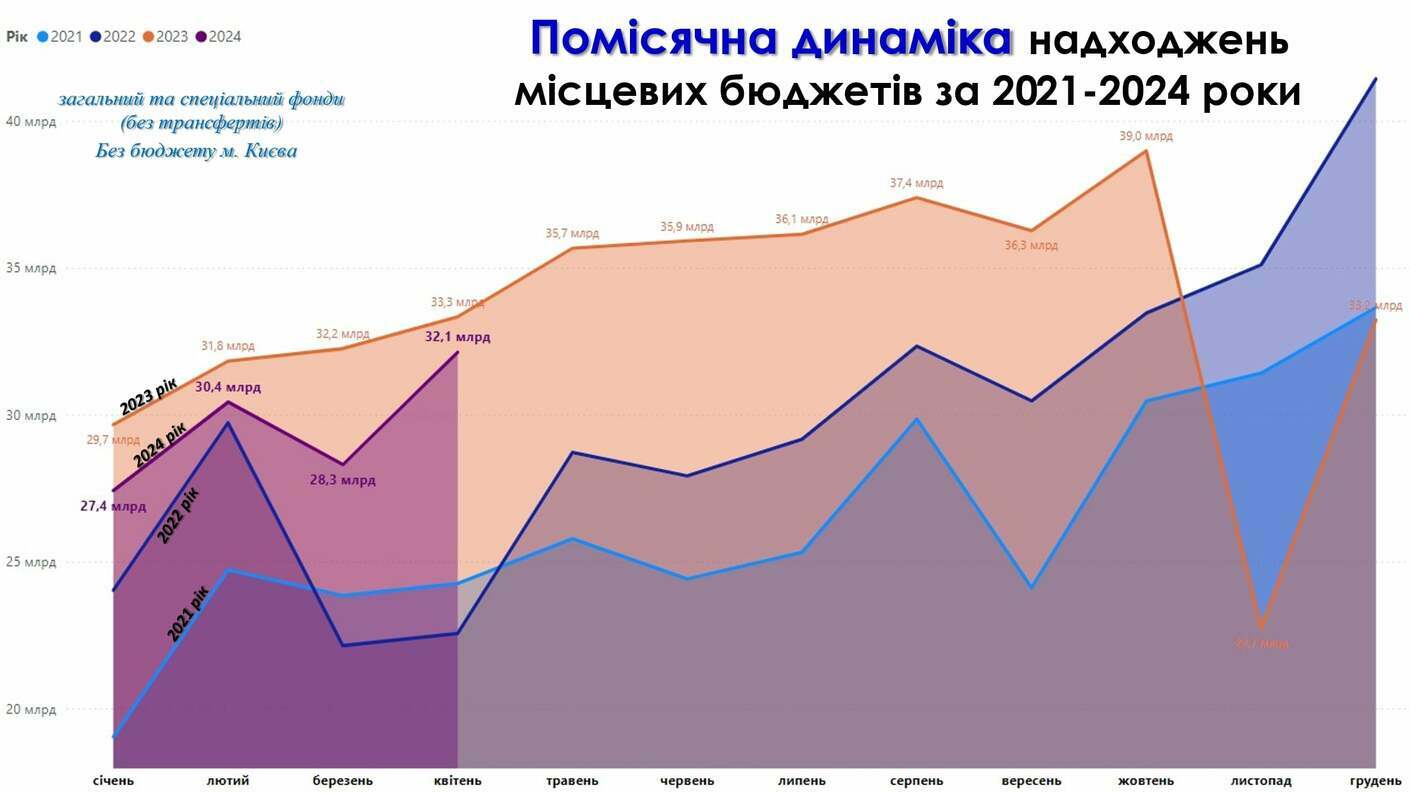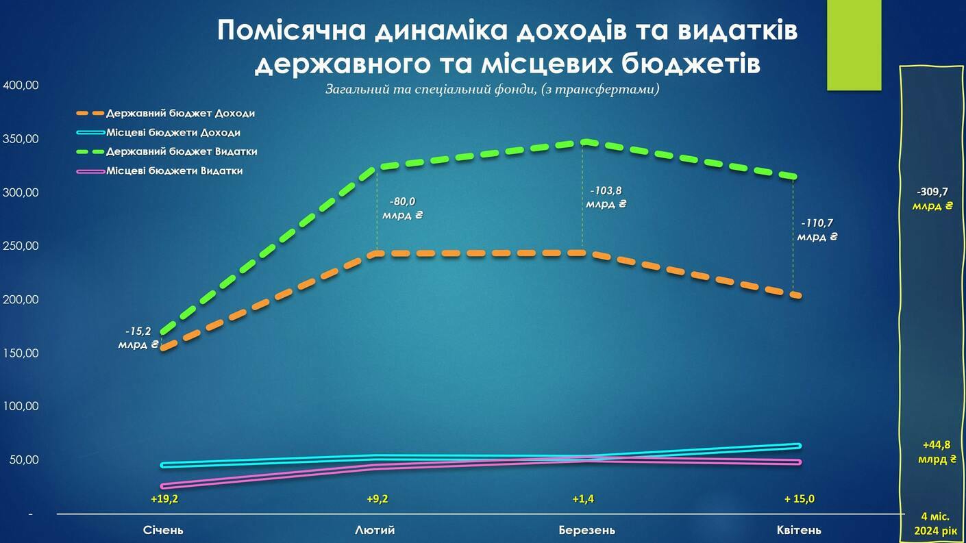 Наведена вище помісячна динаміка доходів державного та місцевих бюджетів у 2024 році зберігається з 2022 року. Загалом за січень-квітень 2024 року надходження до місцевих бюджетів перевищили видатки на 44,8 млрд грн, при цьому дефіцит по державному бюджету вже складає -309,7 млрд грн, який покривається за рахунок фінансування, зокрема внутрішніх та зовнішніх запозичень.