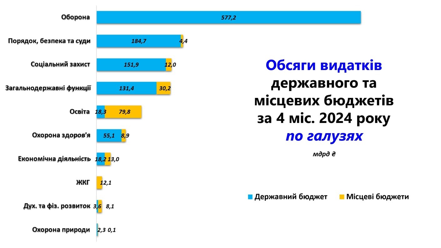 Велика видаткова частина державного бюджету, звісно ж, пов’язана зі значними видатками на сектор оборони, який покривається виключно за рахунок коштів державного бюджету. Так видатки на оборону за 4 місяці 2024 року склали 577,2 млрд грн або 4,8 мільярдів грн на день!