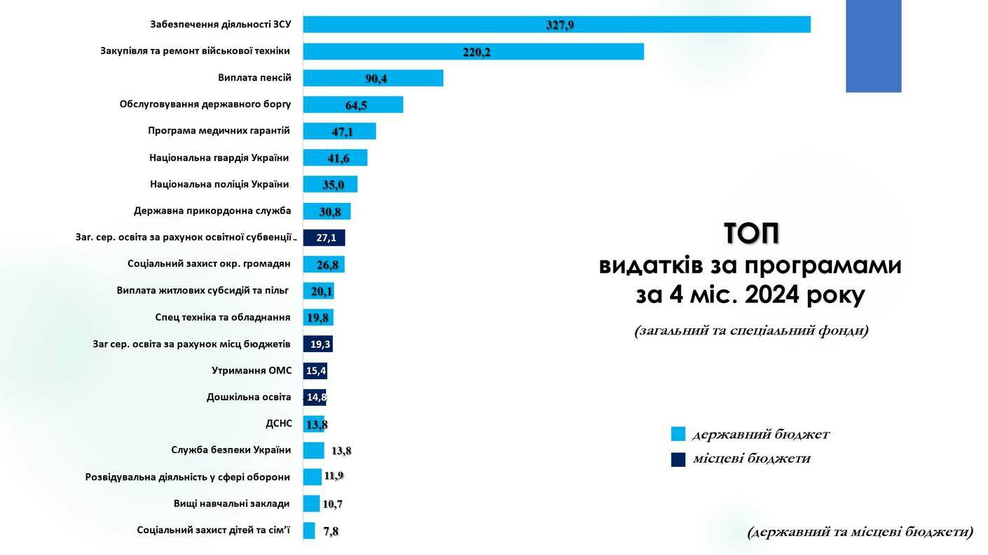 Вищезазначена гістограма ілюструє ТОП видатків за програмами за перші чотири місяці 2024 року, розподілених між державним та місцевими бюджетами. Найбільші видатки припадають на забезпечення діяльності Збройних Сил України (327,9 млрд грн) та закупівлю і ремонт військової техніки (220,2 млрд грн). Виплата пенсій займає третє місце з витратами у 90,4 млрд грн. Ці показники свідчать про пріоритетність фінансування оборони та соціального захисту в державному бюджеті.