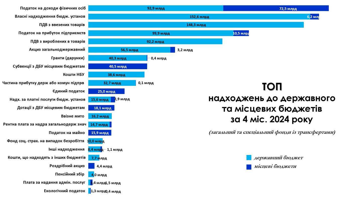 Розглядаючи ТОП надходжень до державного та місцевих бюджетів за перші чотири місяці 2024 року, включаючи загальний та спеціальний фонди із трансфертами, очевидно, що найбільші надходження припадають на податок на доходи фізичних осіб, який складає 92,9 млрд грн для державного бюджету і 72,5 млрд грн для місцевих бюджетів. Власні надходження бюджетних установ займають друге місце з 152,6 млрд грн, що є значним джерелом доходів для державного бюджету.