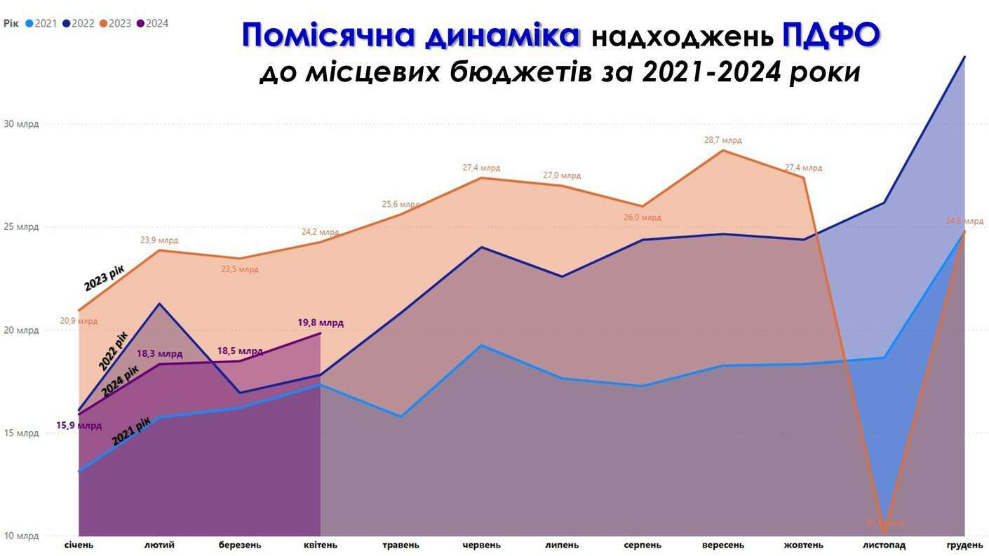 У 2024 році внаслідок вилучення військового ПДФО обсяги надходжень до місцевих бюджетів значно впали і це помітно по помісячній динаміці.