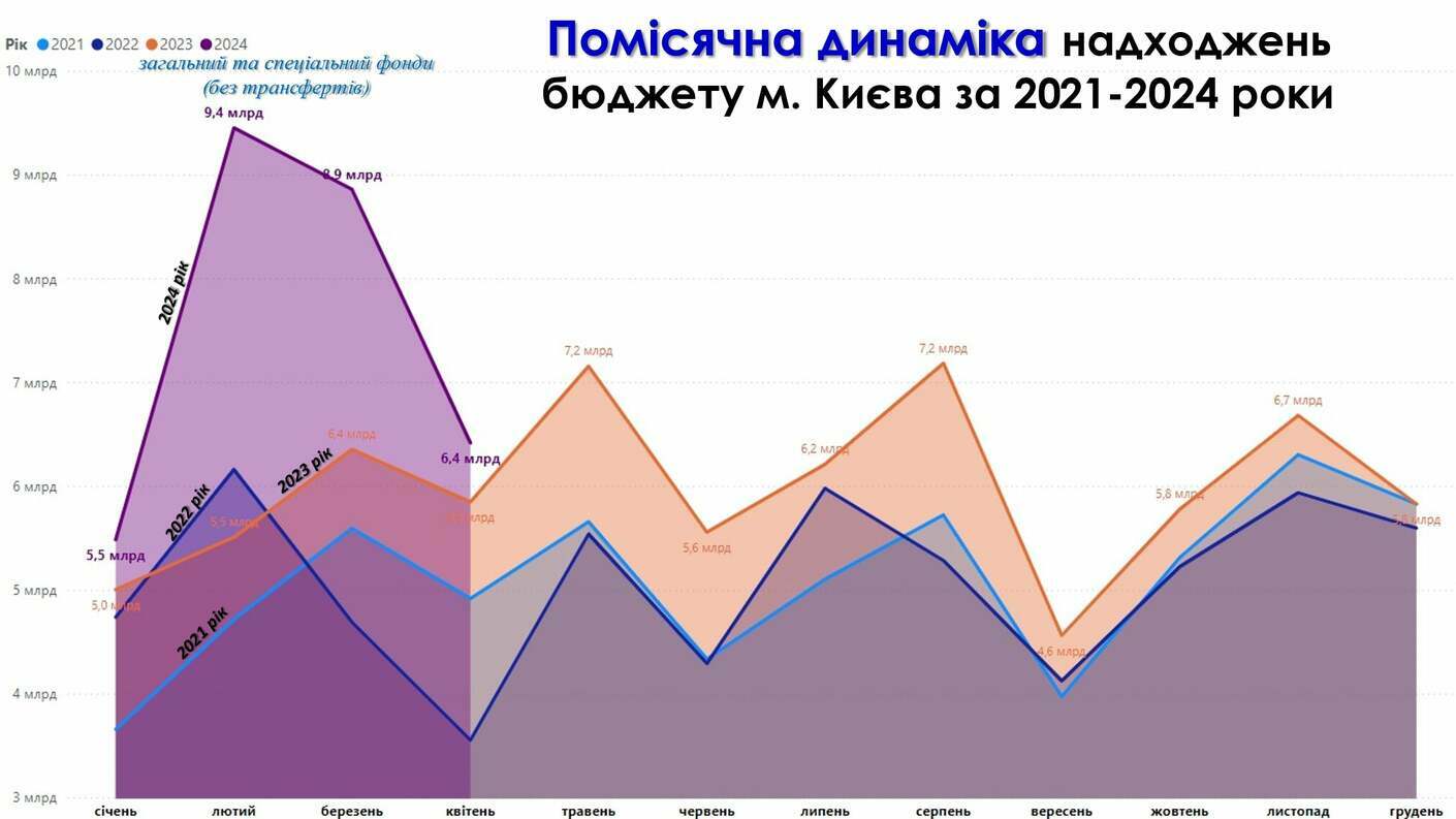 Разом з цим, обсяги надходжень бюджету міста Києва демонструють значне зростання у 2024 році. Так, у лютому 2024 року спостерігається різке зростання до 9,4 млрд грн, що є найвищим показником за весь період з 2021 року. Такі високі обсяги надходжень забезпечив податок на прибуток банківських організацій, включаючи філіали аналогічних організацій, розташованих на території України (+5,1 млрд грн або +3 318,8%). Крім того, позитивну динаміку по бюджету міста Києва показав Єдиний податок (+0,6 млрд грн або +12,6%), ПДФО (+0,6 млрд грн або +5,1%) та Акциз (+0,2 млрд грн або +68,0%).