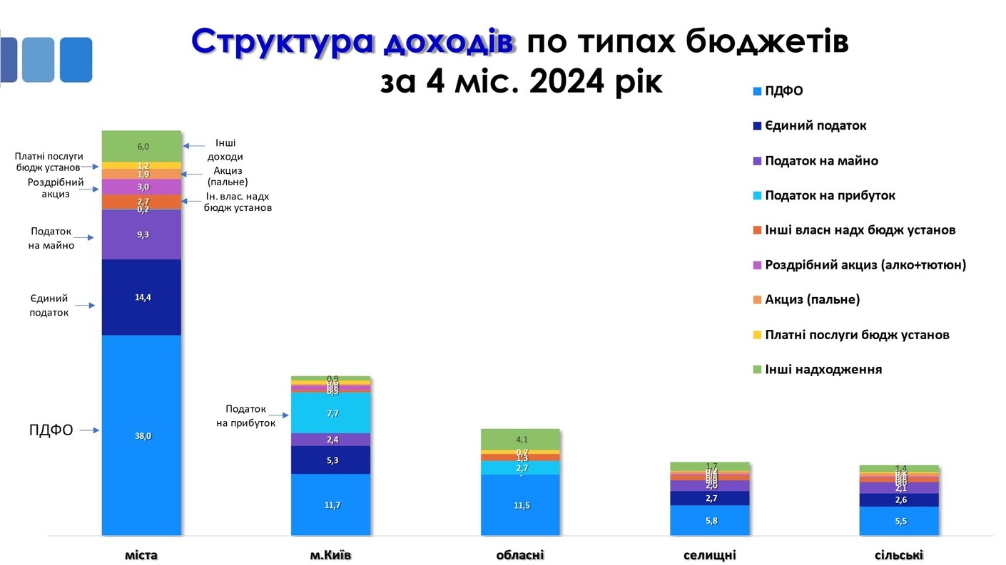 Основним джерелом доходів всіх місцевих бюджетів є ПДФО, для міських бюджетів ПДФО за 4 місяці 2024 року складає 38,0 млрд грн. Наступним за значущістю є єдиний податок — 14,4 млрд грн, а податок на майно становить 9,3 млрд грн. Роздрібний акциз та акциз на пальне приносять 3,0 млрд грн та 1,9 млрд грн відповідно. Інші доходи, такі як платні послуги бюджетних установ та інші власні надходження бюджетних установ, є менш значущими і складають 1,2 млрд грн та 2,7 млрд грн відповідно.