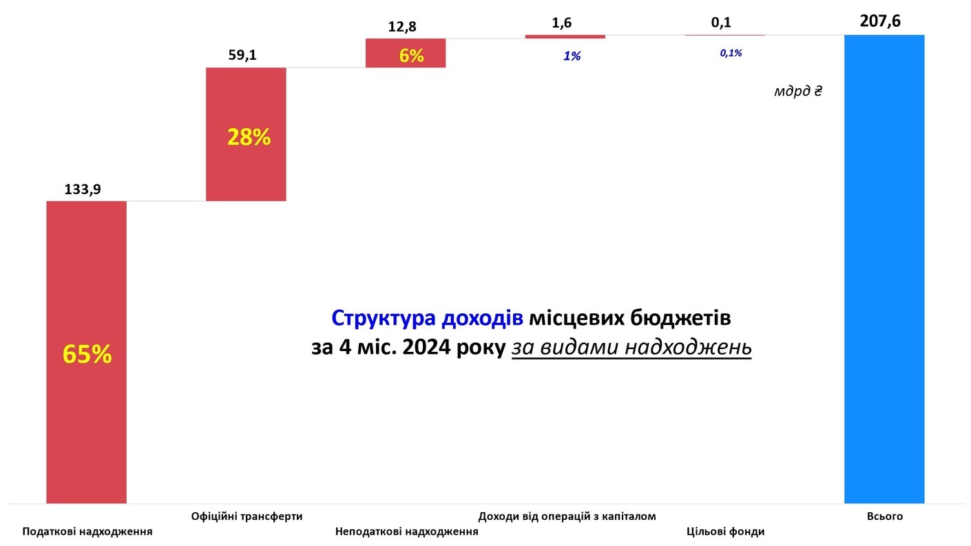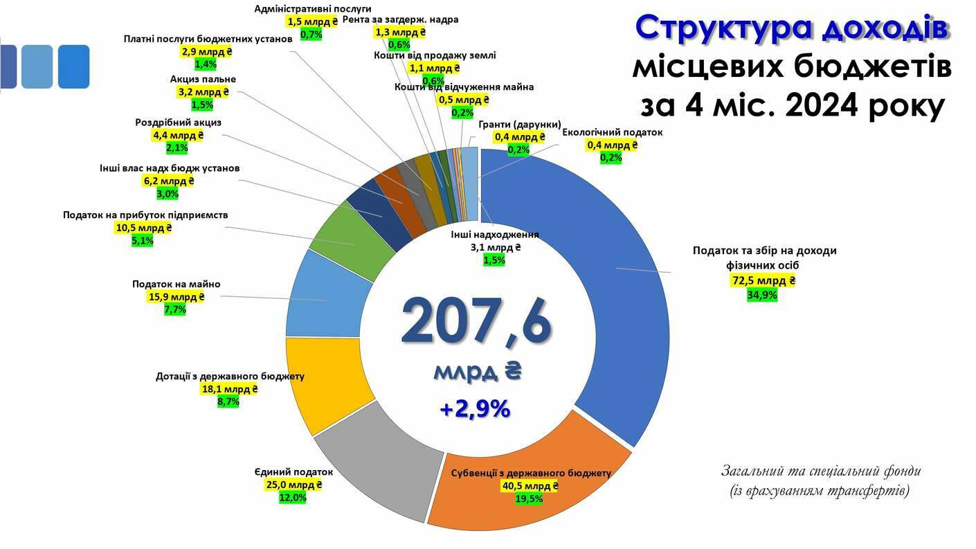 Вищенаведений графік ілюструє структуру доходів місцевих бюджетів України за перші чотири місяці 2024 року. Загальний обсяг доходів становив 207,6 млрд або +2,9% (+5,9 млрд грн), порівняно з аналогічним періодом минулого року. Частка податку на доходи фізичних осіб (ПДФО) складає 34,9% (72,5 млрд грн). Це свідчить про важливість цього податку для місцевих бюджетів.