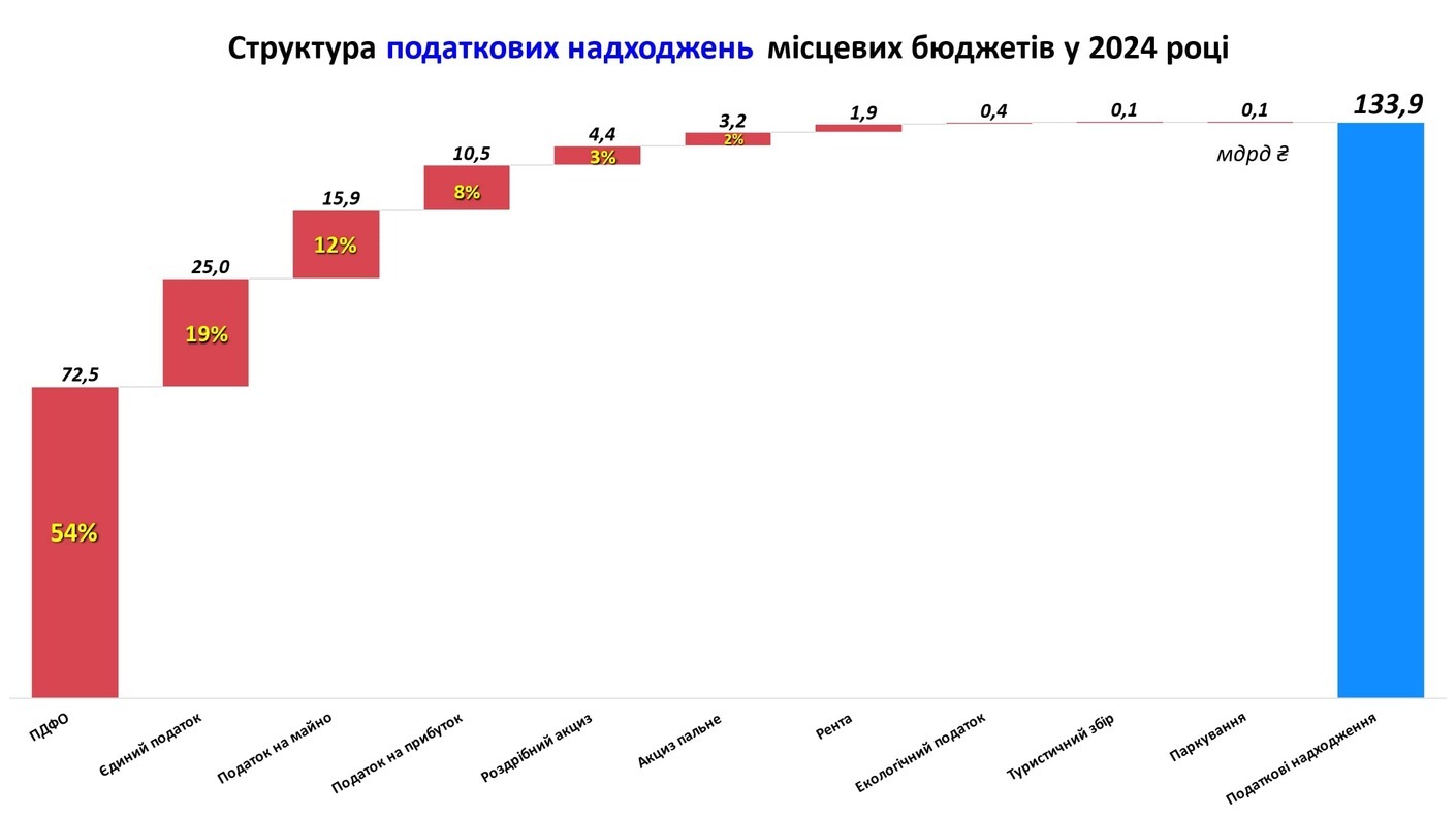 Загалом місцеві бюджети у 2024 році зазнали деяких змін у структурі доходів. Так, частка ПДФО впала до 54% (67% у 2023 році, тобто -13%) у структурі податкових надходжень. При цьому, частка Єдиного податку зросла до 19% (13% у 2023 році). Податок на майно становить 20% (15,9 млрд грн), податок на прибуток – 8% (10,5 млрд грн), роздрібний акциз – 3% (4,4 млрд грн), а акциз на пальне – 2% (3,2 млрд грн). Інші категорії, такі як рента за надра, екологічний податок, туристичний збір та інші, мають незначні частки від загальної суми.
