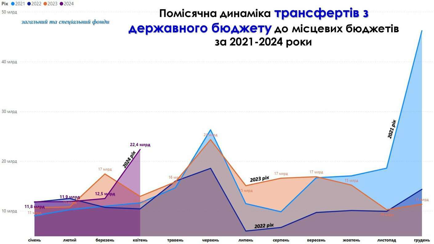 У квітні 2024 року Мінфін згідно з бюджетним законодавством забезпечив перерахування міжбюджетних трансфертів місцевим бюджетам в обсязі 22,4 млрд грн, що становить 94% від передбачених розписом асигнувань, зокрема: