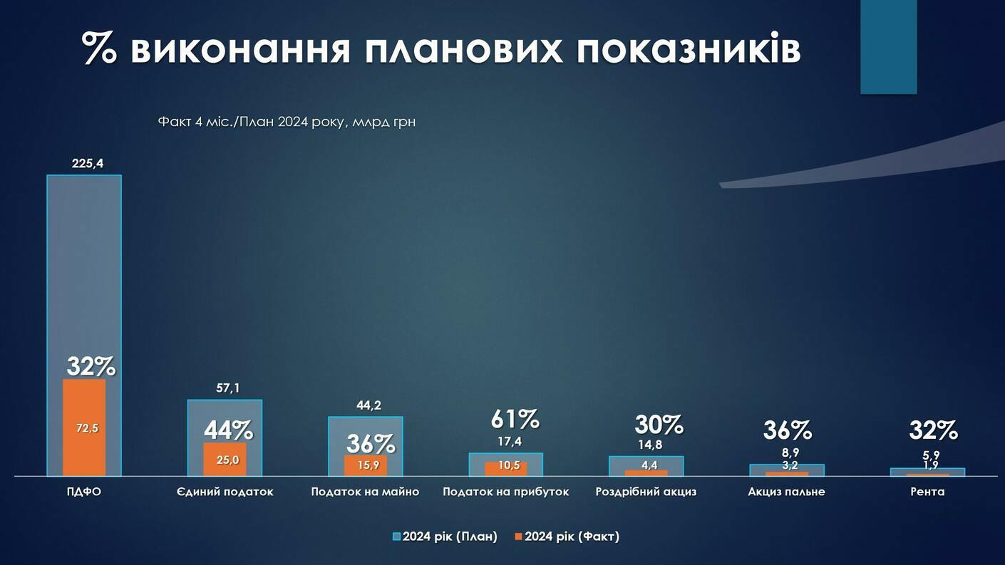 Розглянемо стан виконання планових показників. Найбільшу частку серед податкових надходжень займає податок на доходи фізичних осіб (ПДФО), виконання якого становить 32% від запланованих 225,4 млрд грн, фактично зібрано 72,5 млрд грн.