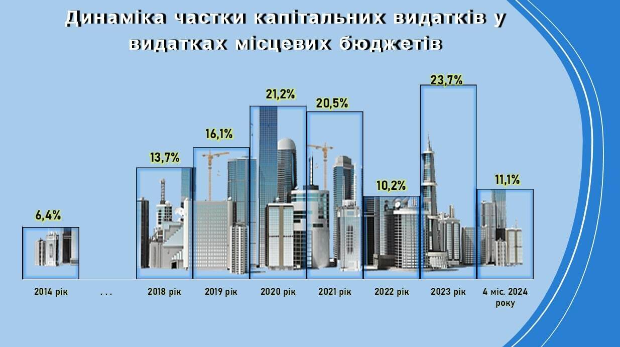 Проте у 2024 році через вилучення значної частини доходів місцевих бюджетів (військового ПДФО) частка капітальних видатків знизилася до11,1%.