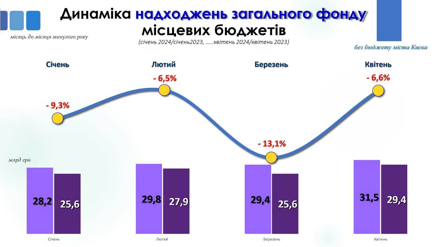 У квітні 2024 року зниження становило 6,6%, у порівнянні з квітнем 2023 року, що демонструє деяке покращення. У квітні 2023 року надходження були на рівні 31,5 млрд грн, а у квітні 2024 року вони становили 29,4 млрд грн. Це свідчить про продовження негативної тенденції у надходженнях загального фонду місцевих бюджетів, хоча темпи спаду дещо зменшилися.