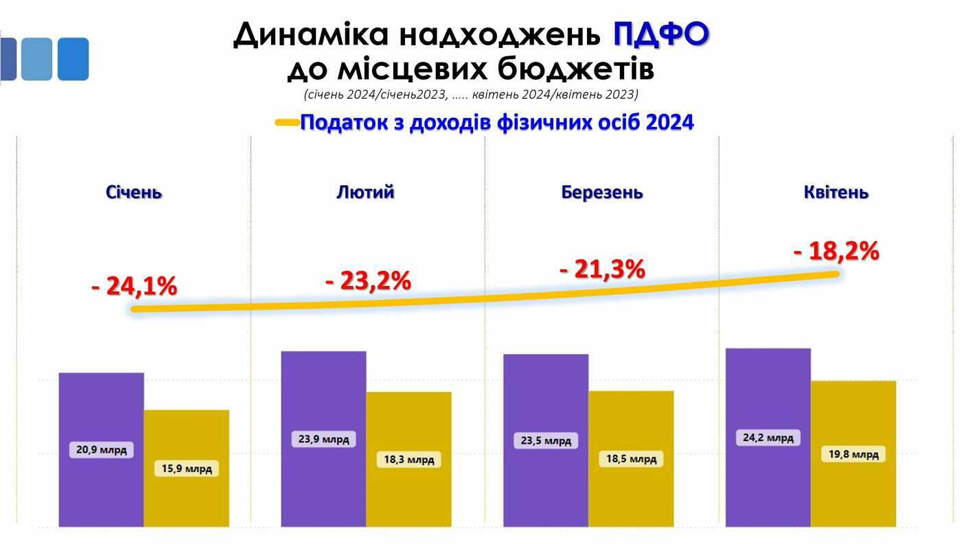 У квітні 2024 року зниження надходжень ПДФО порівняно з квітнем 2023 року склало 18,2%. У квітні 2023 року надходження становили 24,2 млрд грн, а у квітні 2024 року зменшилися до 19,8 млрд грн. Загалом, хоча спостерігається поступове зменшення темпів спаду, надходження ПДФО у 2024 році залишаються суттєво нижчими, порівняно з попереднім роком, що вказує на продовження негативної тенденції.