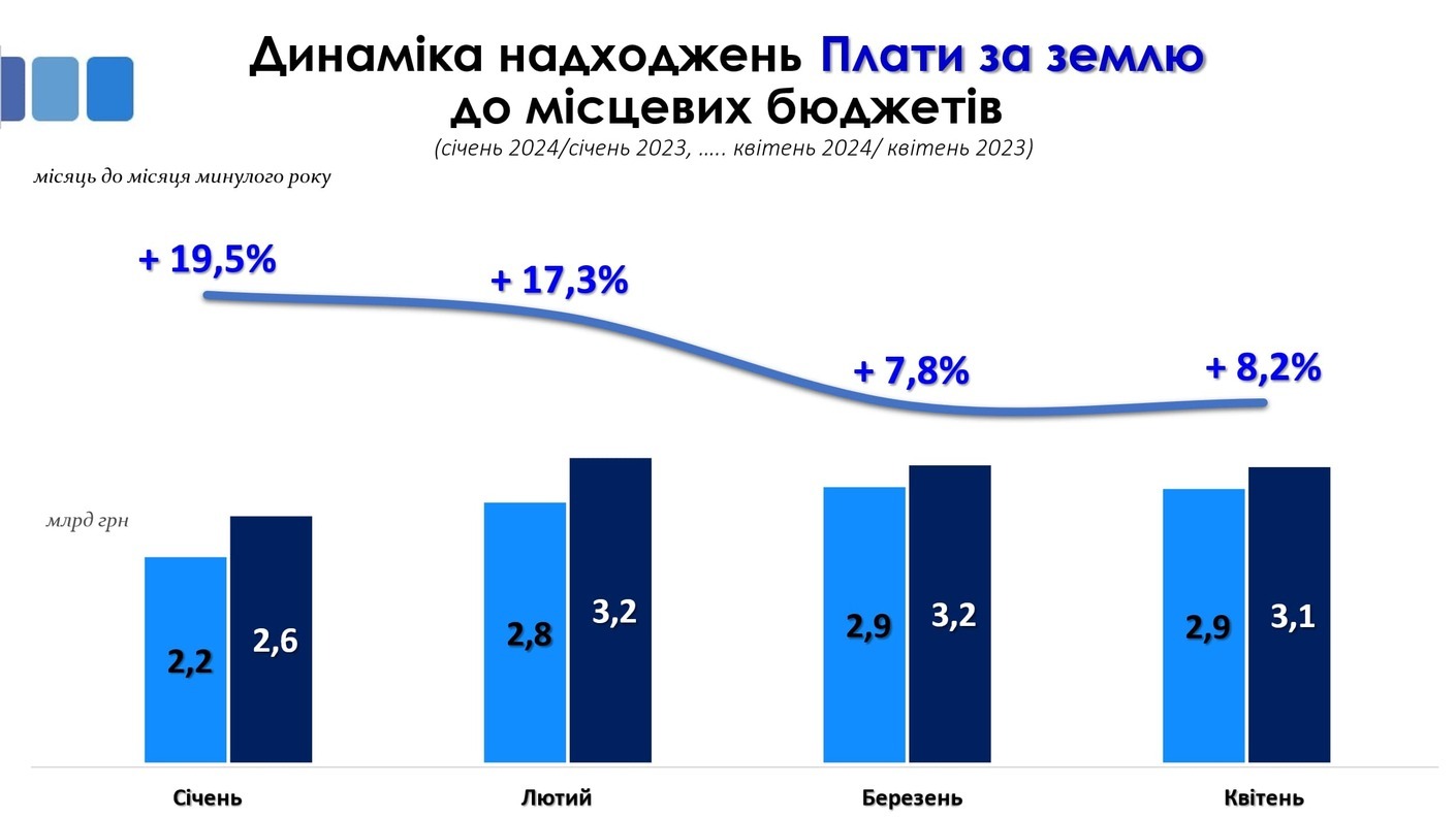 У квітні 2024 року зростання надходжень плати за землю, порівняно з квітнем 2023 року, склало 8,2%. У квітні 2023 року надходження становили 2,9 млрд грн, а у квітні 2024 року зросли до 3,1 млрд грн. Загалом, цей графік ілюструє позитивну динаміку зростання надходжень плати за землю протягом перших чотирьох місяців 2024 року.