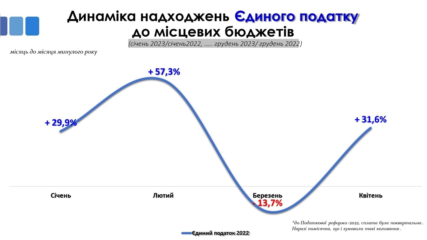 Загалом за перші 4 місяці 2024 року приріст надходжень єдиного податку по бюджетах місцевого самоврядування, в порівнянні із 4 місяцями 2023 року, становить +29,9% або +5,8 млрд грн, що є дуже гарним показником сплати єдиного податку.
