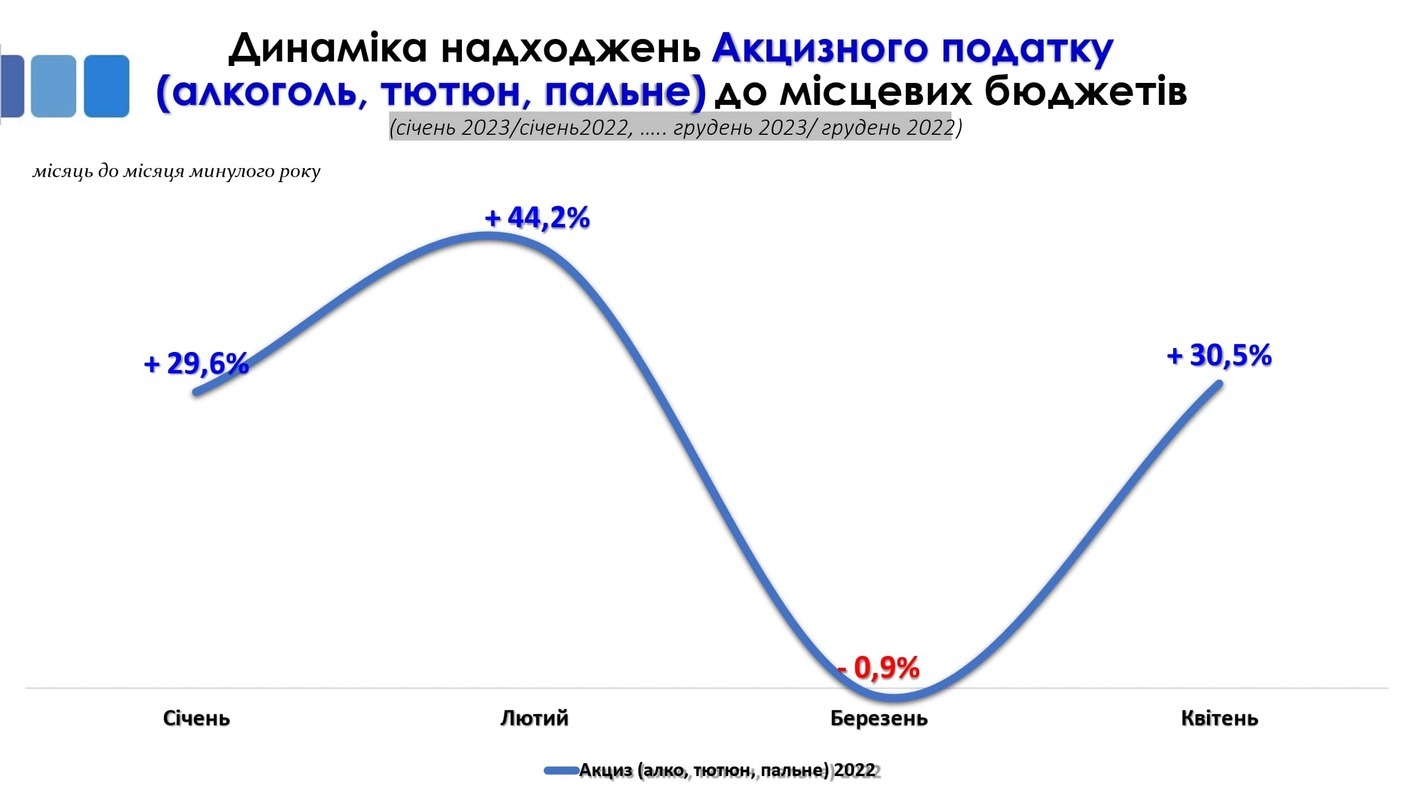 У січні надходження акцизного податку зросли на 29,6%, порівняно з січнем 2022 року. Цей позитивний тренд продовжився в лютому, де зростання склало 44,2%, порівняно з лютим минулого року.