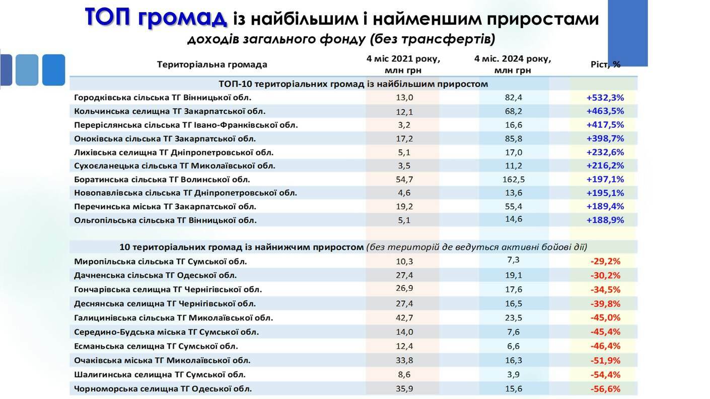 Разом з цим, залишається неврегульованою ситуація зі значними диспропорціями між надходженнями різних громад. Відтак рівень виконання окремих бюджетів територіальних громад у 2024 році суттєво відрізнявся, як і в 2023, 2022 роках, коли дисбаланси приросту між бюджетами перевищували кілька десятків раз. Вище наведено кілька громад із найбільшим і найменшими приростами у 2024 році, порівняно з довоєнним 2021 роком. Очевидно, що політика міжбюджетного вирівнювання потребує невідкладного удосконалення, адже одночасно є громади в яких прирости з року в рік +300-500%, натомість в інших громадах від’ємні показники приросту.