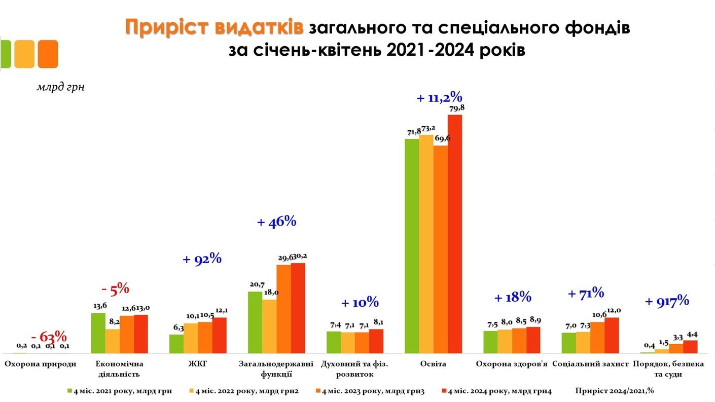 При цьому, ЖКГ (житлово-комунальне господарство) показало значний приріст видатків на 92%, піднявшись з 6,3 млрд грн у 2021 році до 12,1 млрд грн у 2024 році. Видатки на загальнодержавні функції зросли на 46%, з 20,7 млрд грн у 2021 році до 30,2 морд грн у 2024 році.