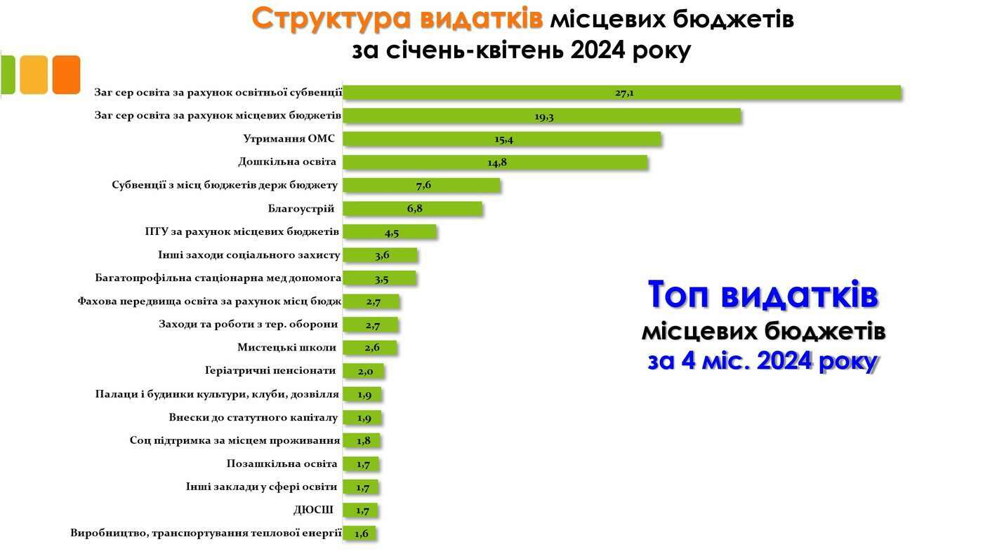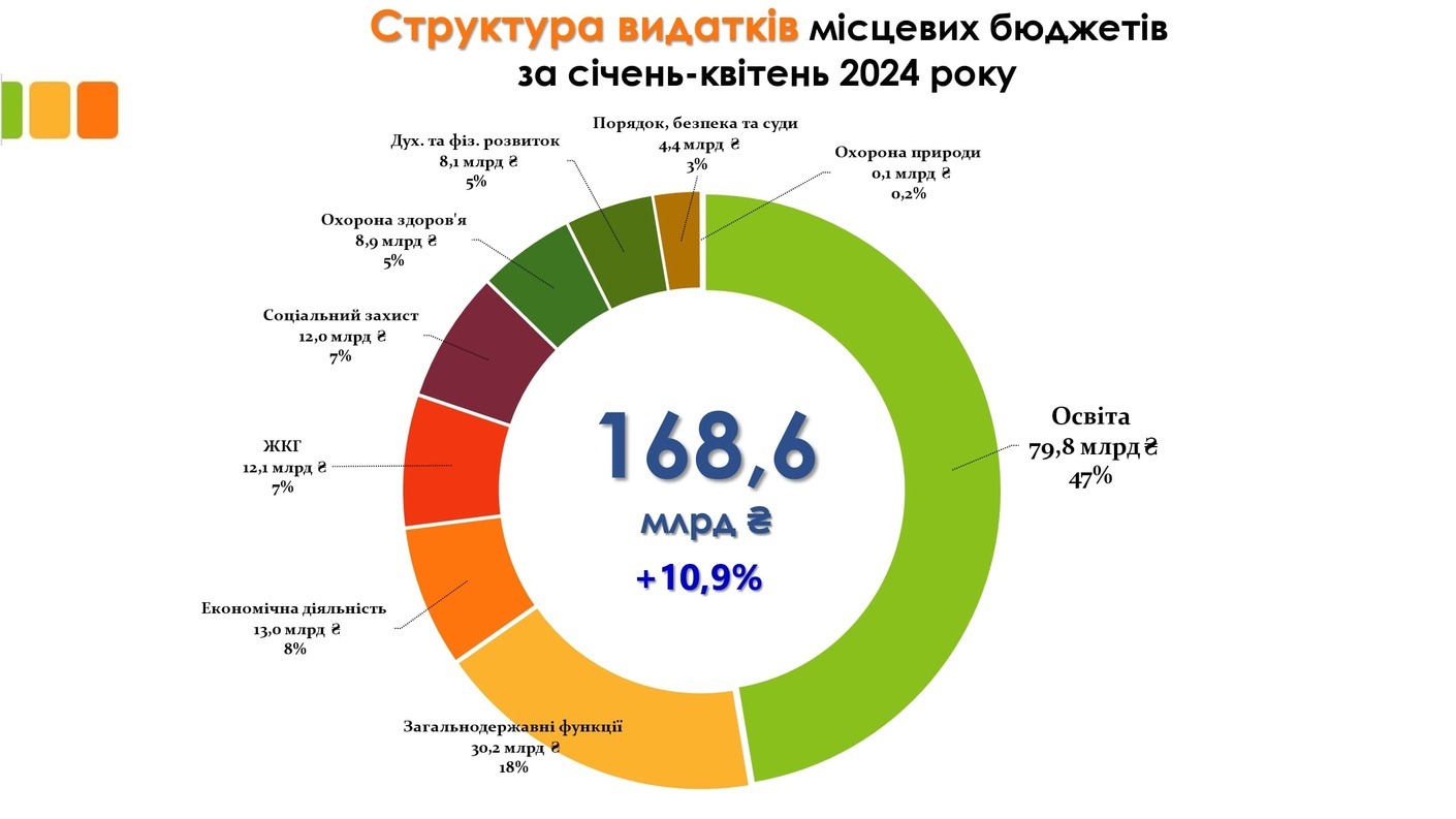 Вищенаведений графік показує структуру видатків місцевих бюджетів за січень-квітень 2024 року, із загальною сумою видатків 168,6 млрд грн, що на 10,9% більше, у порівнянні з відповідним періодом минулого року.