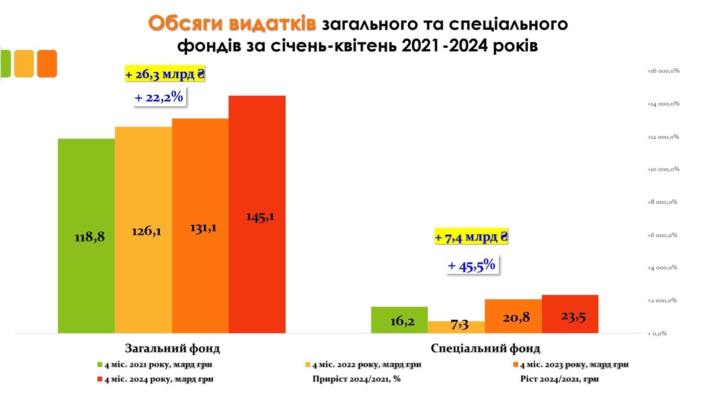 Графік демонструє приріст видатків загального та спеціального фондів за період з січня по квітень з 2021 по 2024 роки за різними категоріями. Графік показує зміну видатків у відсотках та мільярдах грн для кожної категорії, в порівнянні з попередніми роками.
