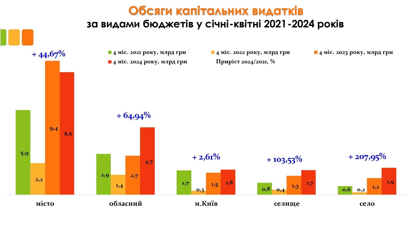 Розглянемо обсяги капітальних видатків у січні-квітня 2024 року за типами бюджетів.