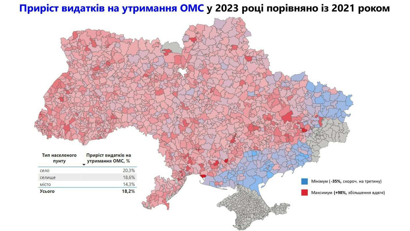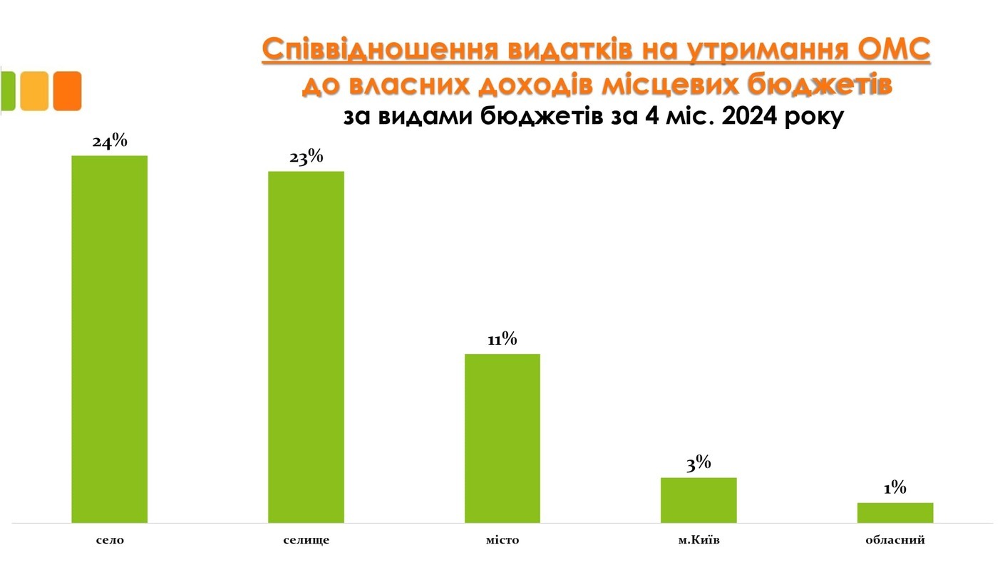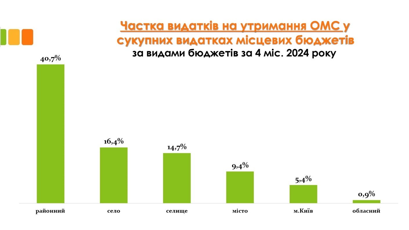 Сільські бюджети також мають значну частку видатків на утримання ОМС, яка складає 16,4%. Найнижчий показник у м. Києва та обласних бюджетах, через які проходить чимало трансфертів, що розмиває зазначений показник.