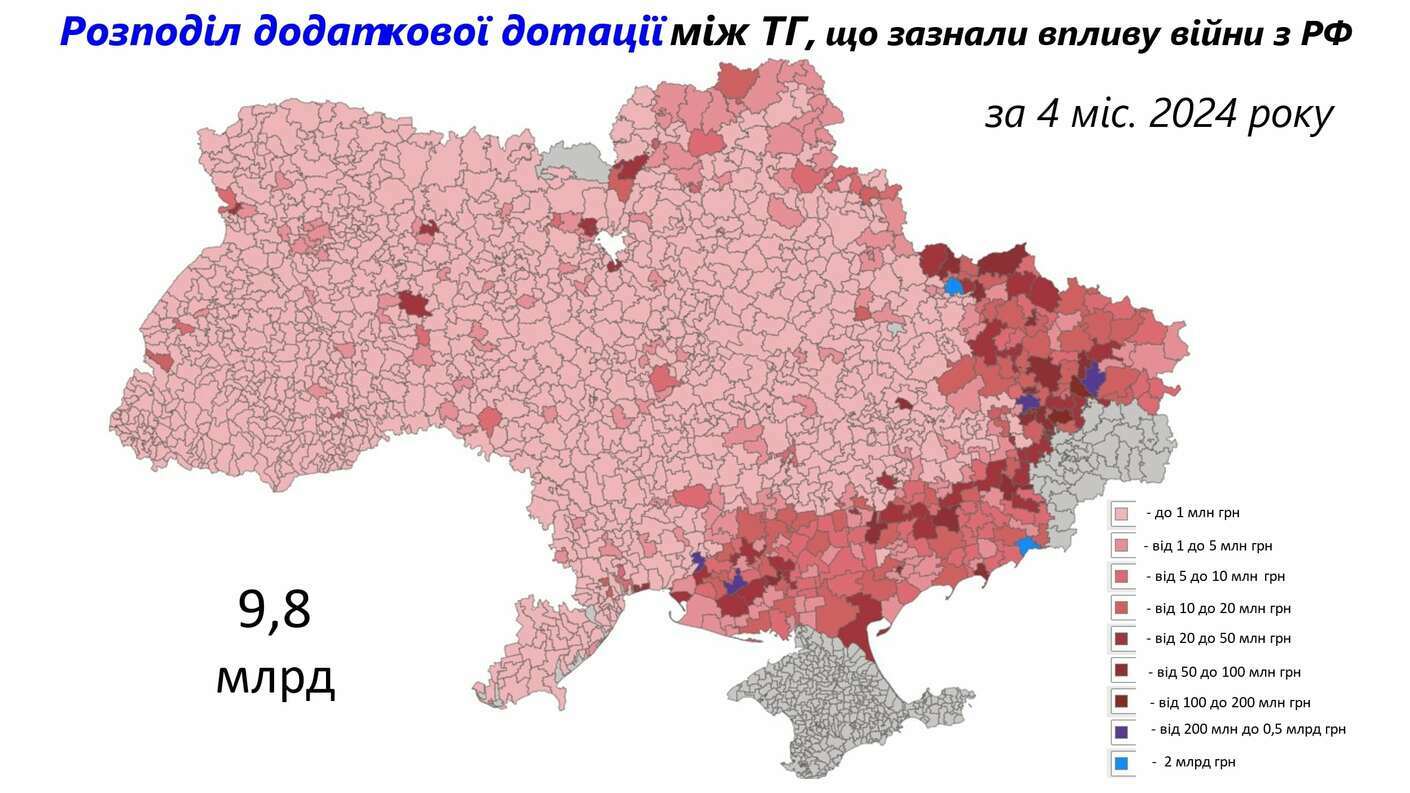 Нижченаведена карта показує розподіл додаткової дотації між територіальними громадами (ТГ) України, які зазнали впливу війни з РФ, за період з січня по квітень 2024 року. Загальна сума дотацій складає 9,8 млрд грн. На карті України виділено громади, які отримали різні суми дотацій, згідно з легендою.