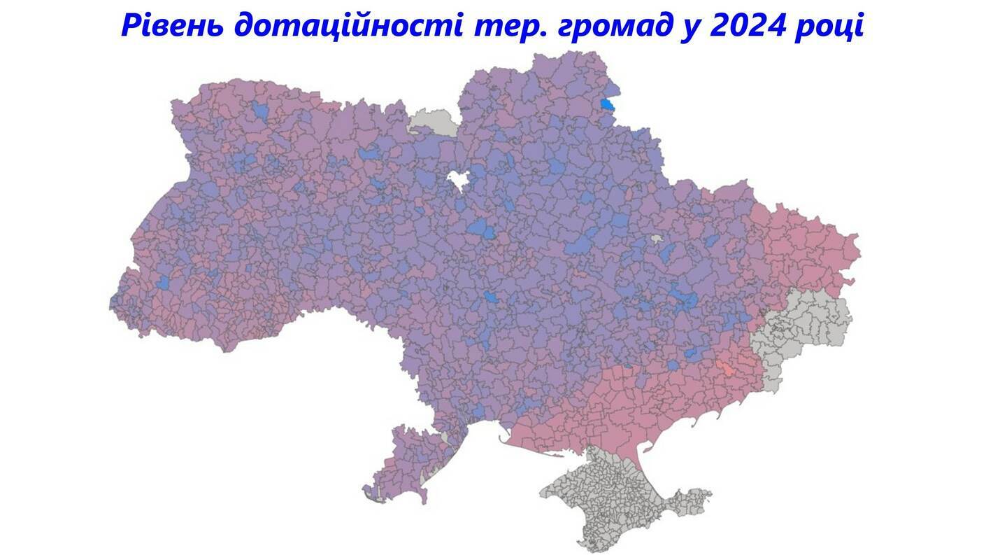 Центральні області мають відносно однаковий рівень дотаційності з незначними відмінностями між громадами. Західніші трішки відрізняються по відтінку як такі які більш залежні від вирівнювання. Загальний рівень дотаційності по країні виглядає більш менш рівномірно розподіленим, незважаючи на прифронтові та окуповані території.