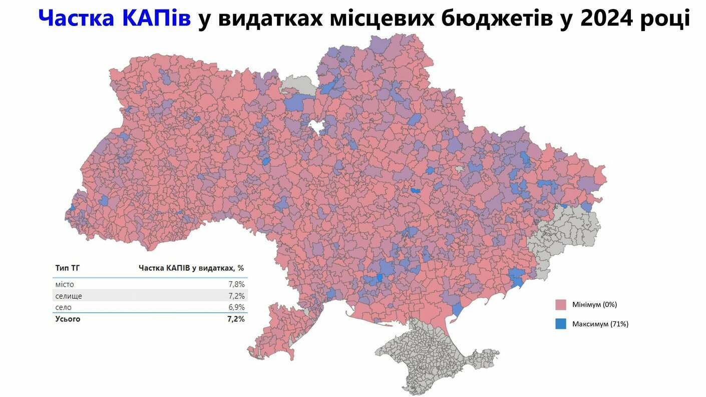 У 2024 році середня частка капітальних видатків по всій Україні впала до 7,2%. Частка КАПів майже вирівнялась по всіх типах бюджетів, але все ж таки міста продовжують утримувати найвищу частку капітальних видатків. Крім цього, наочно із карти помітно наскільки скоротилась кількість громад, які спрямовують на КАПи кошти. До того, ж зберігається значна неоднорідність.