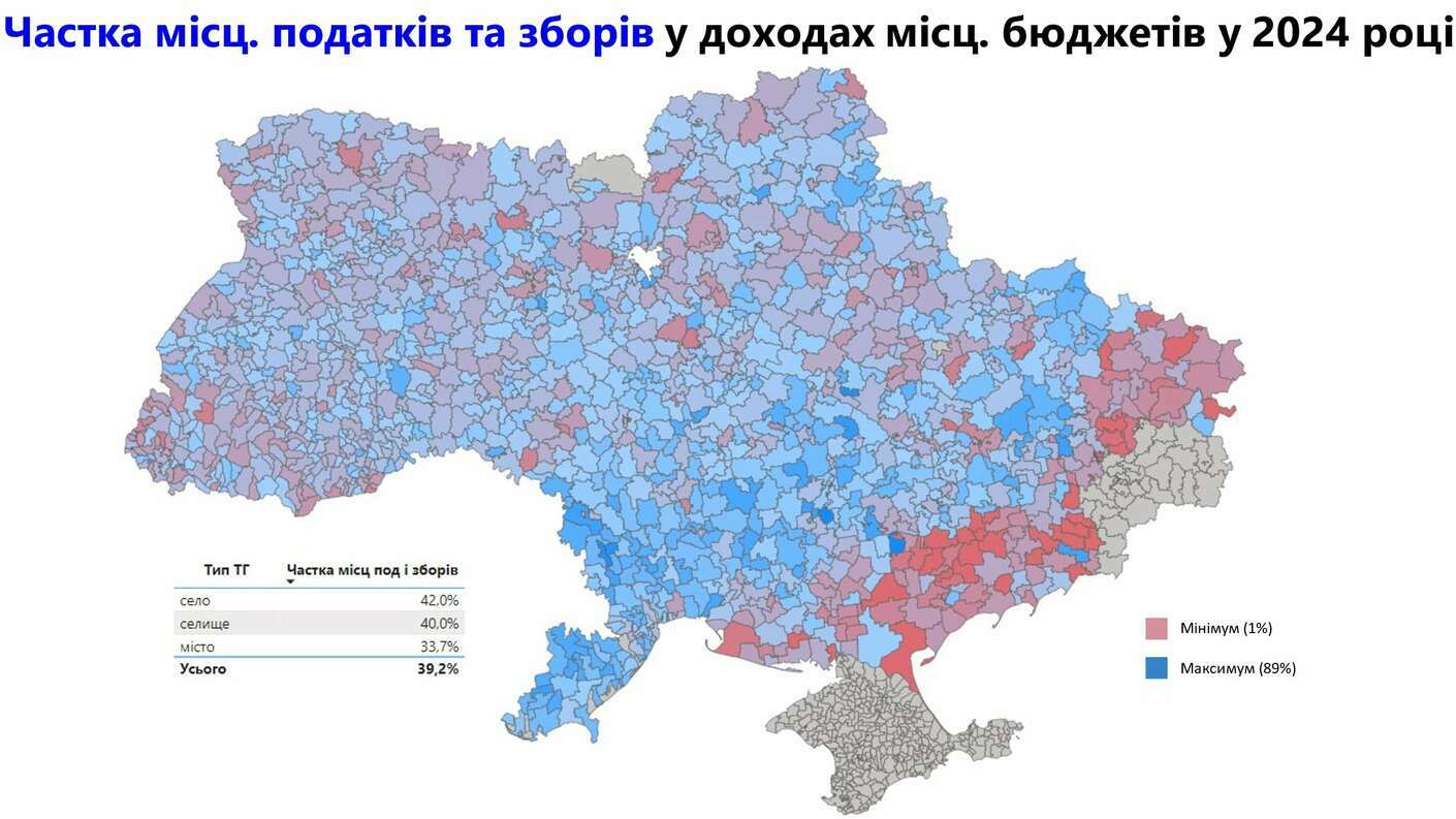 При цьому, частка місцевих податків та зборів у південно-західних та центральних регіонах значно вище середнього показника по Україні. Водночас, цей показник найвищий у селах (42,0%), нижчий у селищах (40,0%) та найнижчий у містах (33,7%). Середній показник по Україні складає 39,2%.