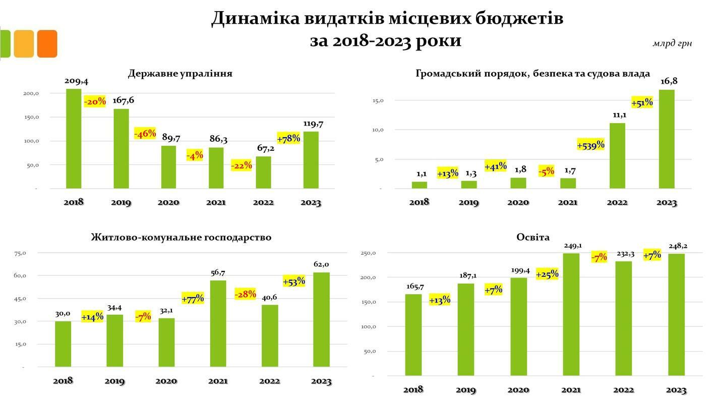 Розглядаючи фінансування окремих галузей за період з 2018 по 2023 роки, помітними є результати децентралізації на прикладі значного щорічного зниження видатків на державне управління. Так, починаючи із 2018 року, такі витрати знизились з 209,4 млрд грн до 67,2 млрд грн у 2022 році. Але зросли на +78% у 2023 році. При цьому, помітне різке зростання видатків на безпеку та порядок в умовах війни у 2022-2023 роках, порівняно із попередніми роками. На жаль, війна змусила скоротити видатки на житлово-комунальне господарство у 2022 році на 28%, але у 2023 році такі видатки зросли на +53%. При цьому, гірша ситуація із фінансуванням сфери освіти, так у 2022 році обсяг виділених коштів знизився, порівняно з 2021 роком на 7%, а у 2023 році фактично майже вийшов на рівень 2021 року.