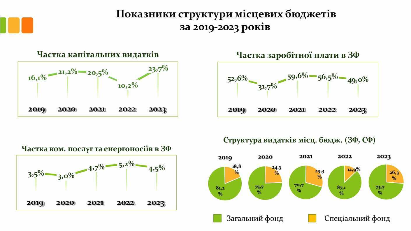 Період 2020-2021 років показує ще більше зростання: у 2020 році частка капітальних видатків досягла 21,2%, а у 2021 році — 20,5%. Звісно, що війна вплинула на структуру видатків і в перший рік війни кошти на розвиток і розширене відтворення знизились до 10,2% у структурі видатків. При цьому, найвищий показник зафіксовано у 2023 році, коли частка капітальних видатків сягнула 23,7% внаслідок значних надходжень військового ПДФО.