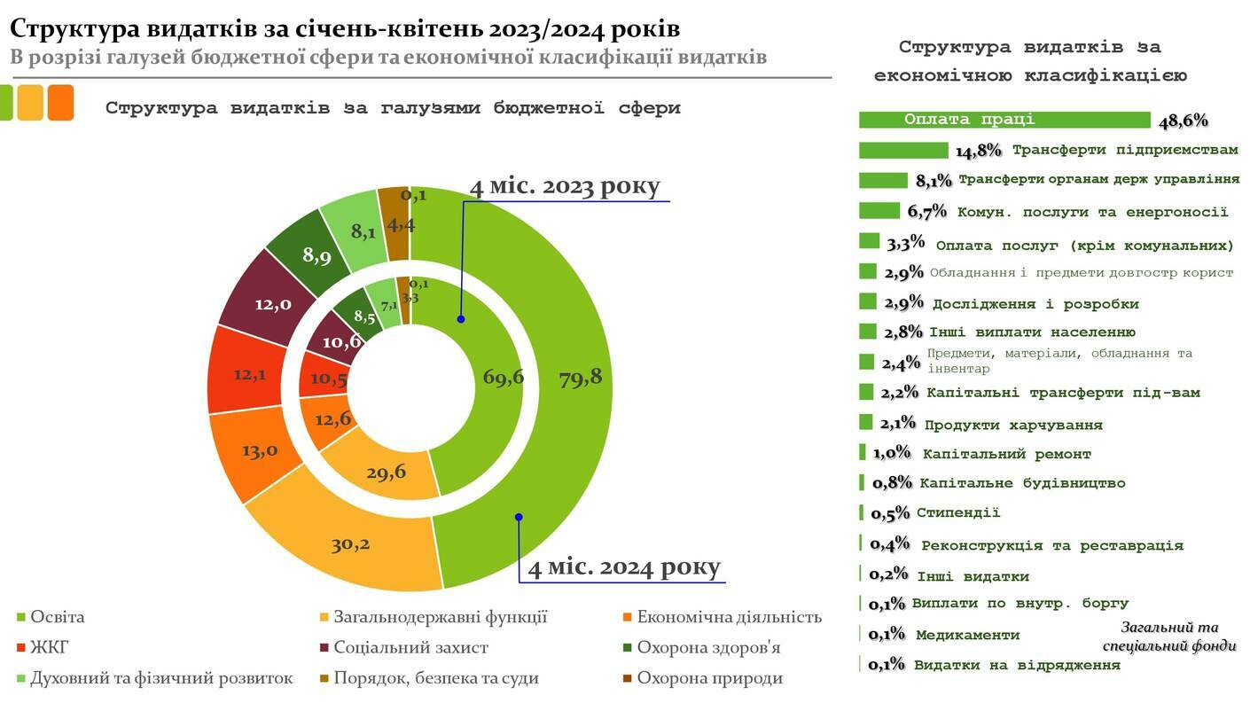 Найбільша частка звісно видатків припадає на освіту, що становить 79,8 млрд грн або 47% від загальної суми. Це підкреслює важливість освітніх програм і забезпечення шкіл та інших навчальних закладів належним фінансуванням.