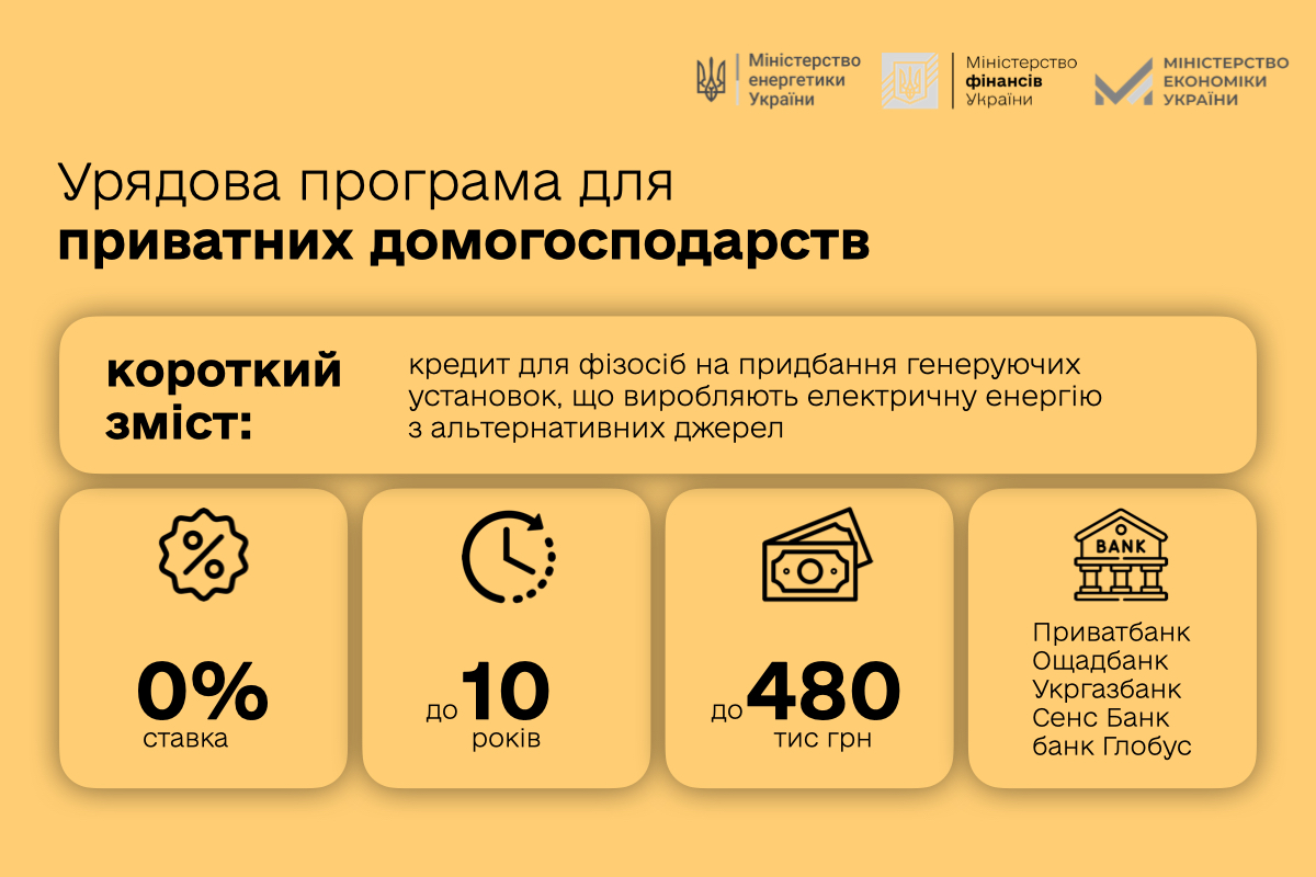 Зокрема, відтепер доступна програма кредитування під 0% для фізичних осіб на придбання генеруючих установок, що виробляють електричну енергію з альтернативних джерел, ініційована Міністерством енергетики, яка спрямована на залучення власників домогосподарств до розбудови власних джерел енергії.