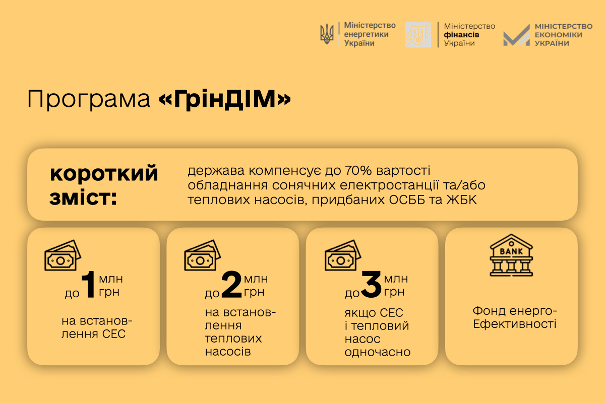 Важливо, що ця кредитна програма може застосовуватись у комплексі із програмою «ГрінДІМ», запровадженою у травні поточного року, за якою держава компенсує до 70% вартості обладнання сонячних електростанцій та/або теплових насосів, придбаних ОСББ та ЖБК. Максимальна сума компенсації: до 1 млн грн на встановлення СЕС, до 2 млн грн – на встановлення теплових насосів, до 3 млн грн — якщо одночасно встановлюється СЕС і тепловий насос. Для участі у програмі «ГрінДІМ» необхідно звернутись до Фонду енергоефективності.