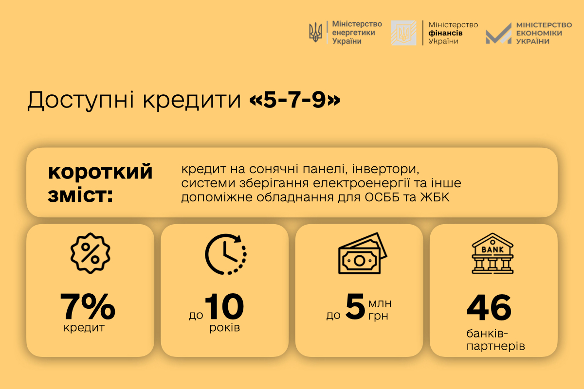 Крім того, за програмою «Доступні кредити 5-7-9» ОСББ та ЖБК можуть отримати кредит у розмірі до 5 млн гривень терміном до 5 років під 7% річних. За ці кошти можна придбати та встановити сонячні панелі, інвертори, системи зберігання електроенергії та інше допоміжне обладнання. Щоб скористатись програмою, треба подати заявку до одного із 46 банків, які співпрацюють з державою за програмою «Доступні кредити 5-7-9». Зокрема, вже працюють над наданням таких кредитів «Ощадбанк», банк «Восток», «Приватбанк», «Сенс Банк», «Укргазбанк», «Глобус», «Скай Банк».