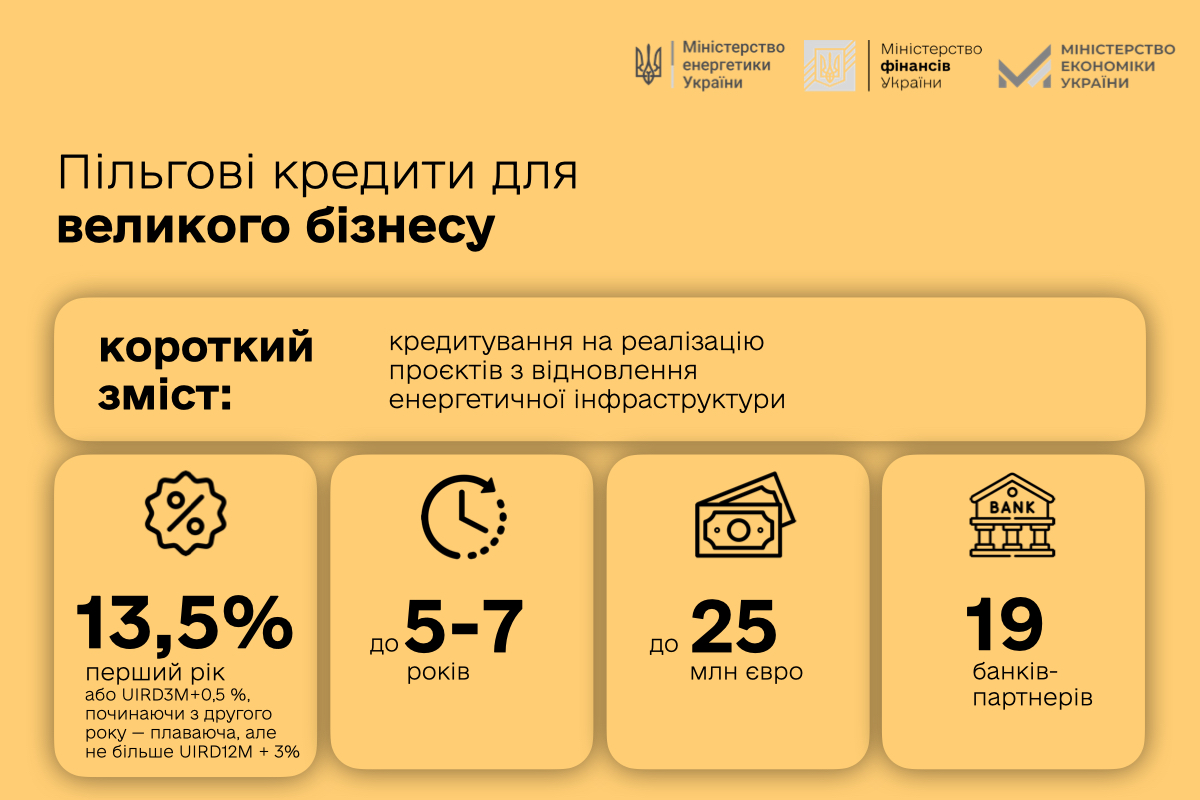 Для підприємств, що планують розбудовувати власну генерацію на суму понад 150 млн грн, доступні пропозиції від 19 найбільших банків України, які надають пільгове кредитування на реалізацію проєктів з відновлення енергетичної інфраструктури. Сума кредиту може становити до 25 млн євро. Термін — до 5 - 7 років, базова відсоткова ставка для кредитів у національній валюті: на перший рік — 13,5% річних або UIRD3M+0,5 % починаючи з другого року — плаваюча, але не більше UIRD12M + 3%.
