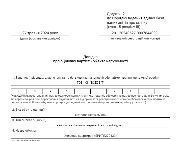 Рисунок 4. Візуалізація довідки про оціночну вартість об’єкта нерухомості