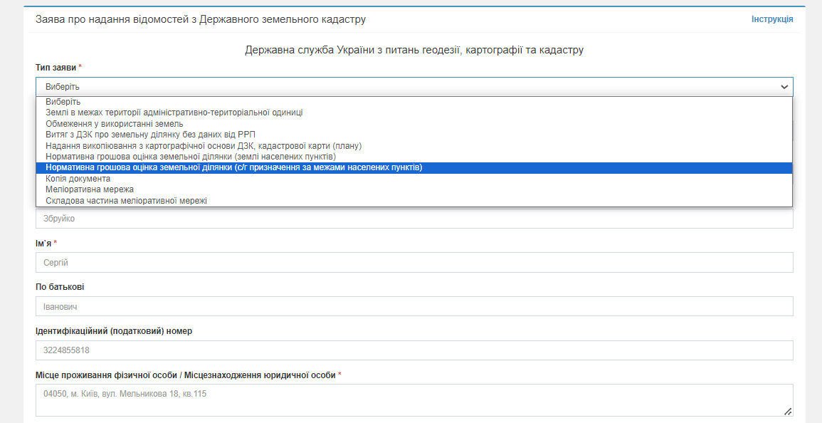 Дані про нормативну грошову оцінку окремої земельної ділянки оформляються за заявою, форму якої наведено у додатку 16 Методики нормативної грошової оцінки земельних ділянок, як витяг із технічної документації з нормативної грошової оцінки земельних ділянок. Згідно з порядком витяг із технічної документації з нормативної грошової оцінки земельних ділянок оформляється і видається автоматично в електронній формі з використанням програмного забезпечення Державного земельного кадастру.