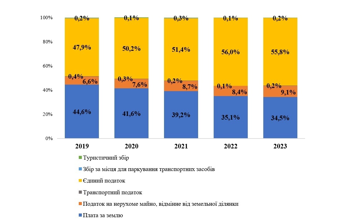 У структурі місцевих податків і зборів найбільшу частку займає єдиний податок. Протягом 2019-2023 років його частка в структурі місцевих податків і зборів зросла з 49,9% у 2019 році до 56,0% та 55,8% у 2022 та 2023 роках відповідно (рис.1). Водночас, фіксується суттєве зменшення частки плати за землю – із 44,6% у 2019 році до 34,5% у 2023, тобто надходження плати за землю у структурі місцевих податків і зборів за останні 5 років втратили 10,1 відсоткових пункти. Серед можливих причин такого зменшення як абсолютних показників надходжень, так і частки у структурі місцевих податків і зборів, ймовірно, є зменшення площі оподатковуваних земель внаслідок бойових дій на відповідних територіях, відсутність дієвого механізму встановлення економічно обґрунтованої оцінки землі для цілей оподаткування, не повністю проведена інвентаризація земель (виявлення земель, що не використовуються, використовуються нераціонально або не за цільовим призначенням, встановлення кількісних та якісних характеристик земель, і як наслідок не залучених до сфери фіскальних відносин).