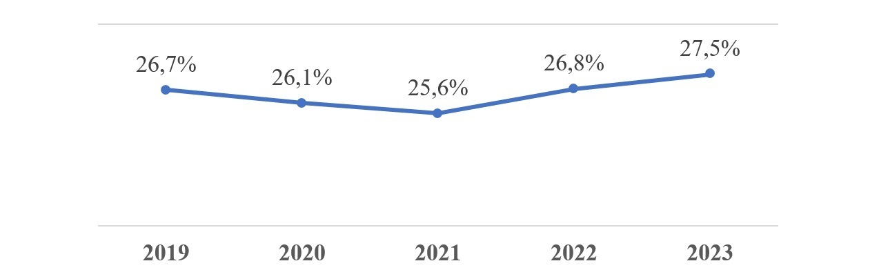 Протягом 2019-2023 років частка місцевих податків і зборів у обсязі доходів загального фонду місцевих бюджетів (без урахування трансфертів) становила в середньому 24,4%, коливаючись від 21,2% у 2022 році до 26,7% у 2019 році. Таким чином, впродовж періоду, що взято для аналізу, частка місцевих податків і зборів у доходах загального фонду місцевих бюджетів (без урахування трансфертів) зменшилася на 4,1 відсоткових пункти – з 26,7% у 2019 році до 22,6% у 2023 році.