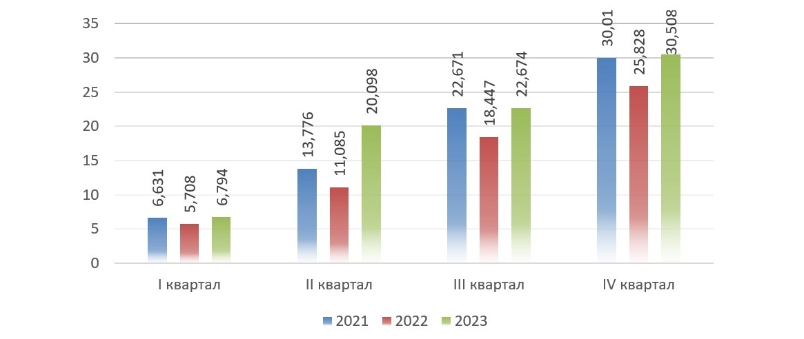 Рисунок 1. Надходження до місцевих бюджетів за кварталами, 2021-2023 рр. (млрд грн)[2]