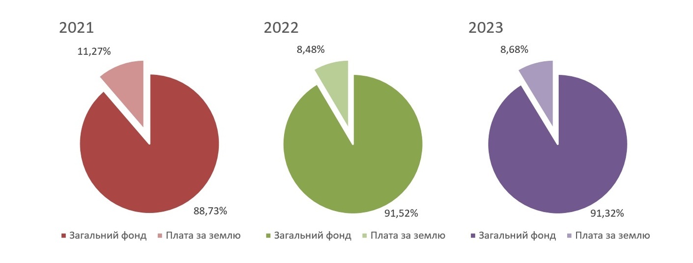 Таким чином, податкові надходження до місцевих бюджетів за рахунок плати за землю та інших платежів склали у середньому 10,5% від надходжень загального фонду в період за 2021-2023 роки. Даний показник є вагомим. Проте його значення може суттєво варіюватися через різні процедури оцінки землі, яка є основою для оподаткування в Україні.