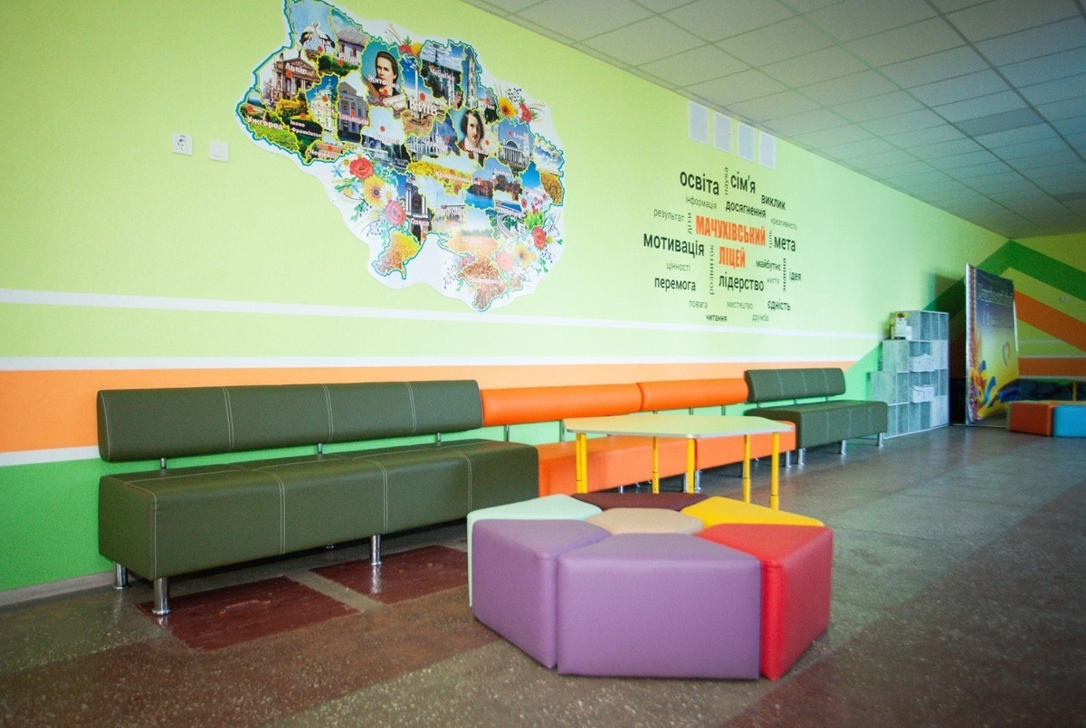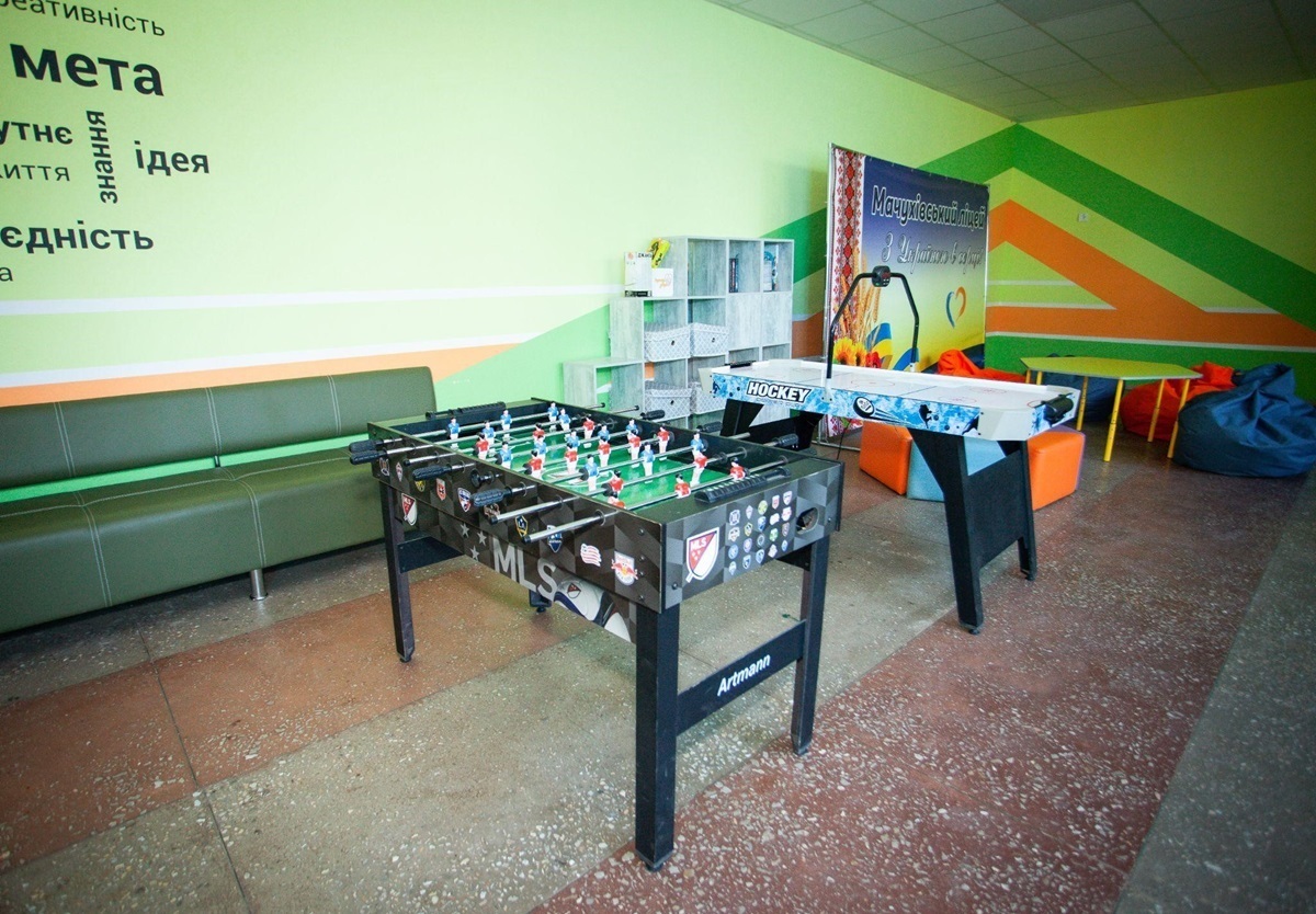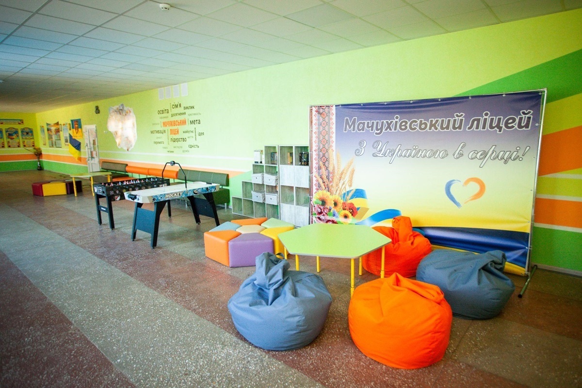 • Зона відпочинку в шкільному фоє «Chill & Fun» у Мачухівському ліцеї. У коридорі школи облаштували зону з диванами, пуфами та безкаркасними кріслами. Також є столики для настільних ігор та полички з книжками, аерохокей, настільний футбол та інші настільні ігри.