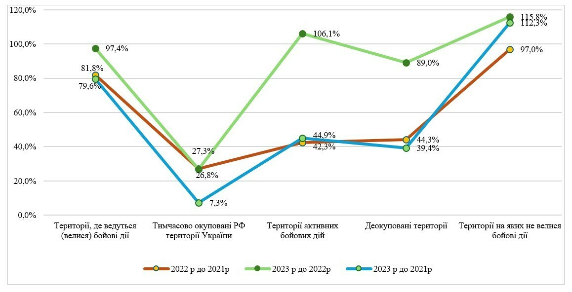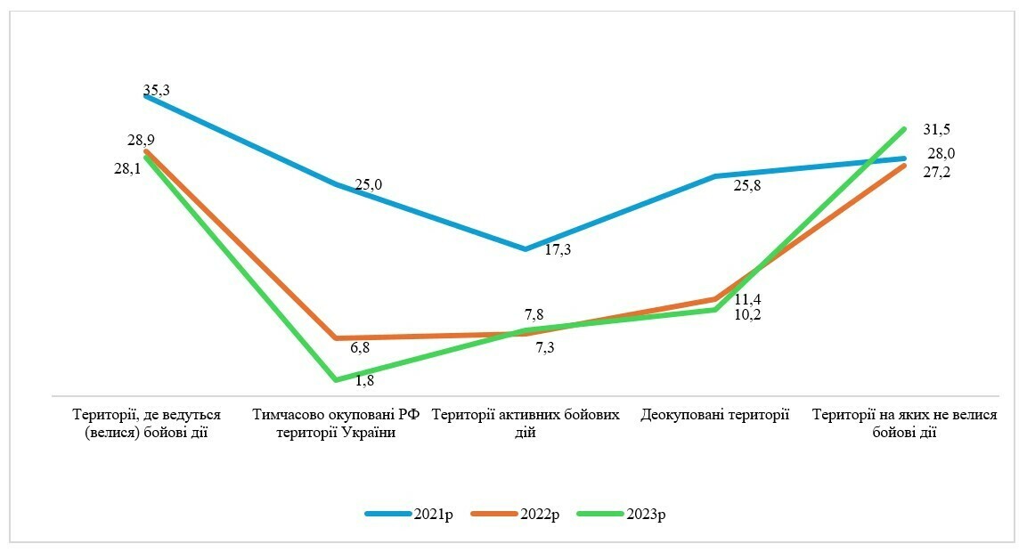 Динаміка надходжень плати за землю до бюджетів ТГ значною мірою залежала від ситуації, у який опинилися громади під час війни. Найбільше зменшення надходжень плати за землю у 2023 році (на 92,7%) та у 2022 році (на 72,7%) порівняно із показниками 2021 року спостерігається за бюджетами тимчасово окупованих громад. Поряд з цим, лише по групі громад, які віддалені від зони бойових дій, було досягнуто перевищення довоєнного рівня.