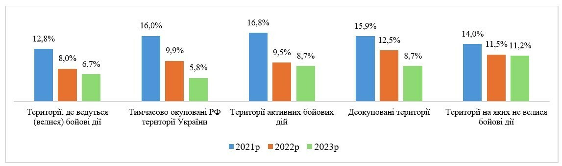 В обсязі власних доходів загального фонду (без урахування міжбюджетних трансфертів) питома вага плати за землю у 2023 році склала 8,6%, у 2022 році цей показник становив 9,8%, тоді як у 2021 році – 14,2%. Скорочення питомої ваги плати за землю у 2023 році відбулося на 1,2 відсоткових пункти (в.п.) у порівнянні із 2022 роком та на 5,6 в.п. проти 2021 року. Найбільше скорочення відбулося по територіальних громадах, території яких тимчасово окуповані РФ.