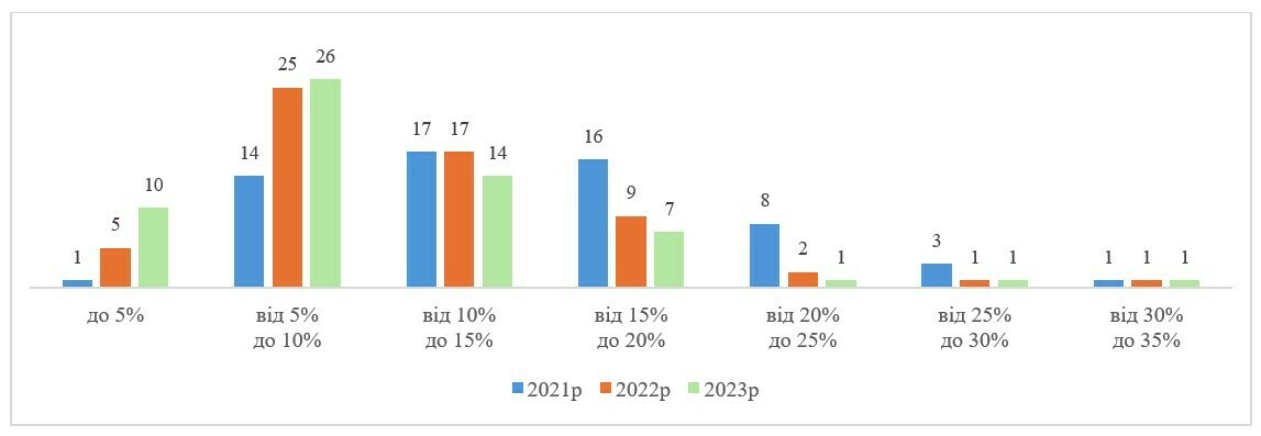 Рис. 5. Кількість громад за шкалою питомої ваги плати за землю у складі власних доходів загального фонду бюджетів громад за 2021-2023 роки