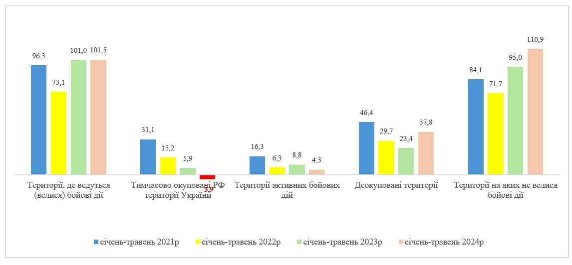 За січень-травень 2024 року в цілому по 60-ти громадах не досягнуто рівня січня-травня 2021 року на 8,6%. Поряд з цим, зростання надходжень плати за землю відбулося по 34-х бюджетах територіальних громад серед яких 22 – це громади, на території яких не велися бойові дії. А от по бюджетах громад, території яких окуповані та в зоні активних бойових дій, стан надходжень плати за землю погіршується, адже за січень-травеь 2024 року відбулося скорочення надходжень у порівнянні із січнем-травнем 2023 року в цілому по зазначених громадах на 97% та у порівнянні із аналогічним періодом довоєнного 2021 року – на 99%.