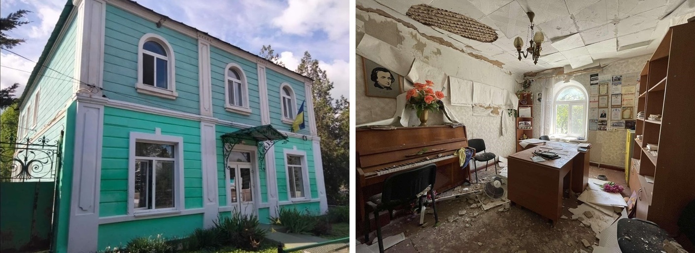 Приміщення дитячої мистецької школи Березнегуватської громади (Харківська область) до 24 лютого 2022 року та після початку повномасштабного вторгнення