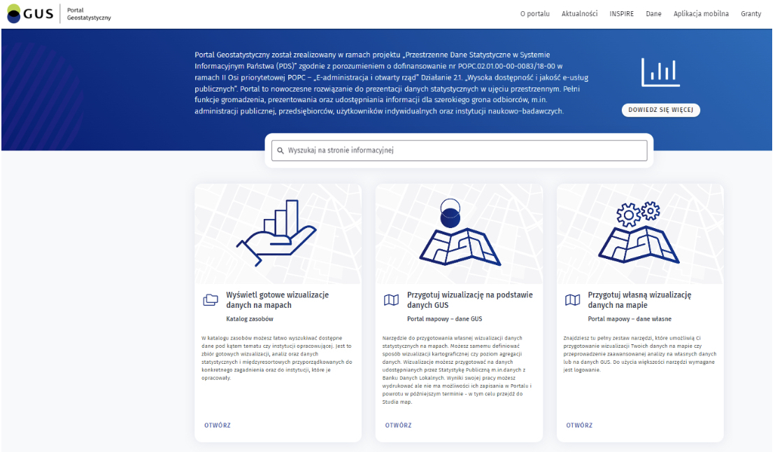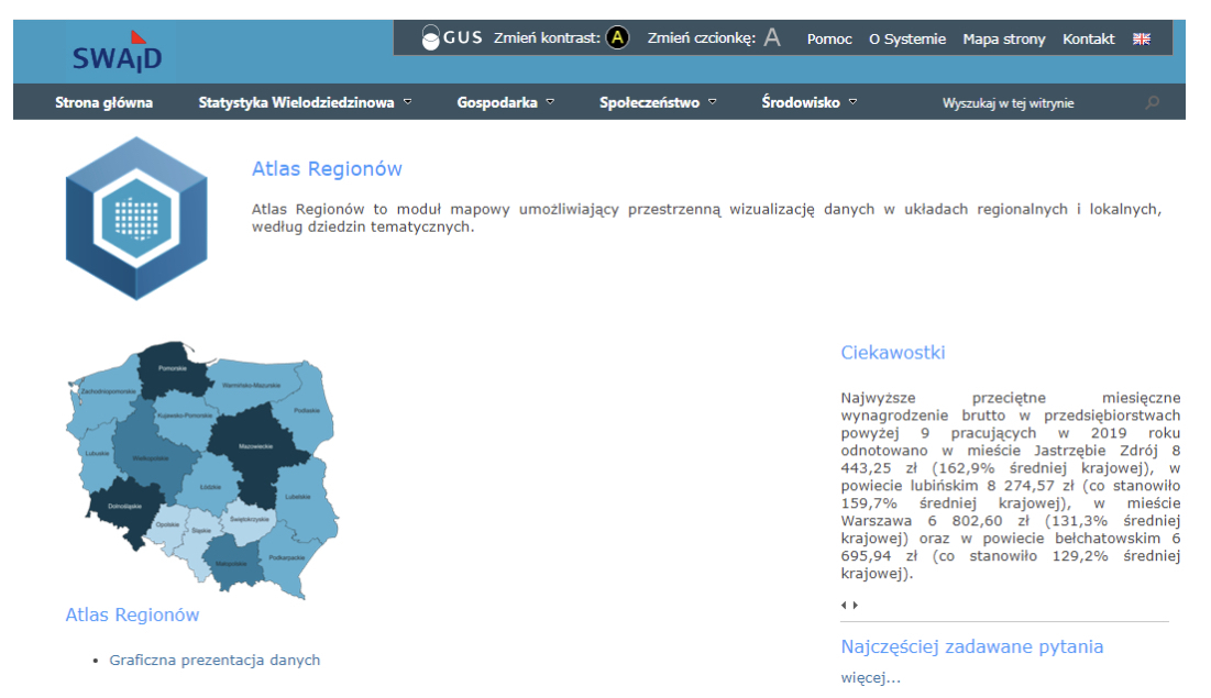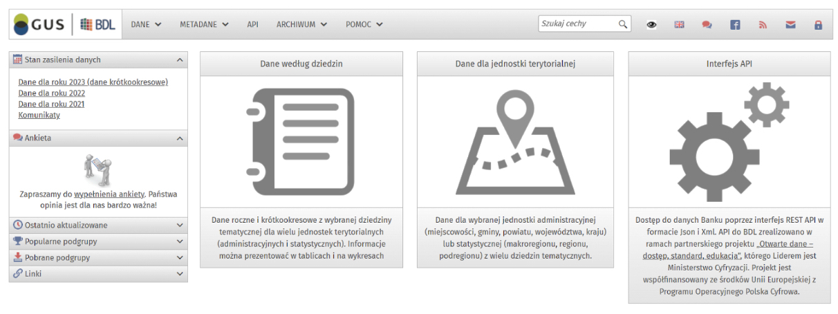 Для збору та поширення статистичних показників у Польщі створено Банк даних BANK DANYCH LOKALNYCH – це найбільша в Польщі база даних про економіку, суспільство та довкілля (Рис. 1.1). Банк пропонує понад 40 тис. статистичних характеристик, згрупованих тематично. Перші дані у Банку наявні з 1995 року. Серед груп показників наявні дані за адміністративно-територіальним поділом[3] – різноманітні тематичні дані збираються та узагальнюються для вибраної адміністративної одиниці (міста, гміни, району, воєводства, країни) або статистичної одиниці відповідно номенклатурі NUTS (макрорегіону, регіону, субрегіону).