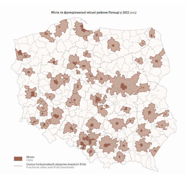 Рис. 1.2. Міста та функціональні міські райони Польщі відповідно до класифікації DegUrba.