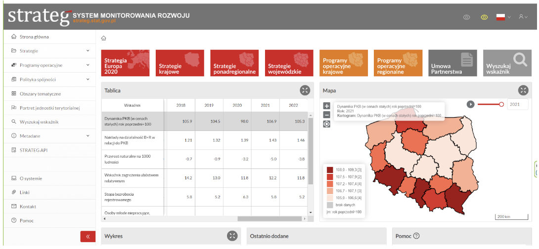 - Система STRATEG (рис.1.6) - інформація про ключові показники, зокрема індикатори для моніторингу досягнення цілей розвитку країни, визначених у найважливіших стратегічних документах[12]. Через елемент «Портрет територіальних одиниць» можна вибрати територіальну одиницю від національного рівня до рівня гмін.