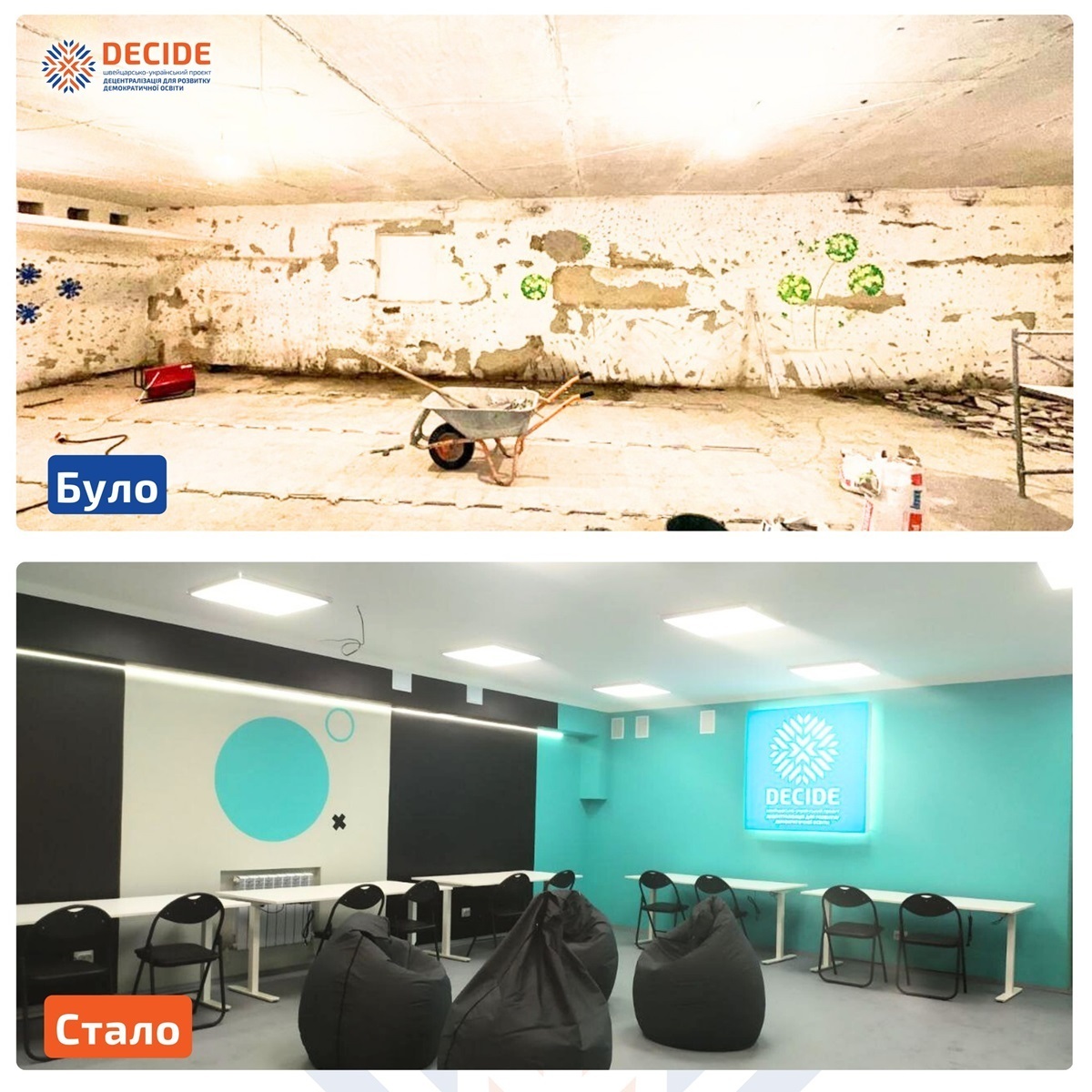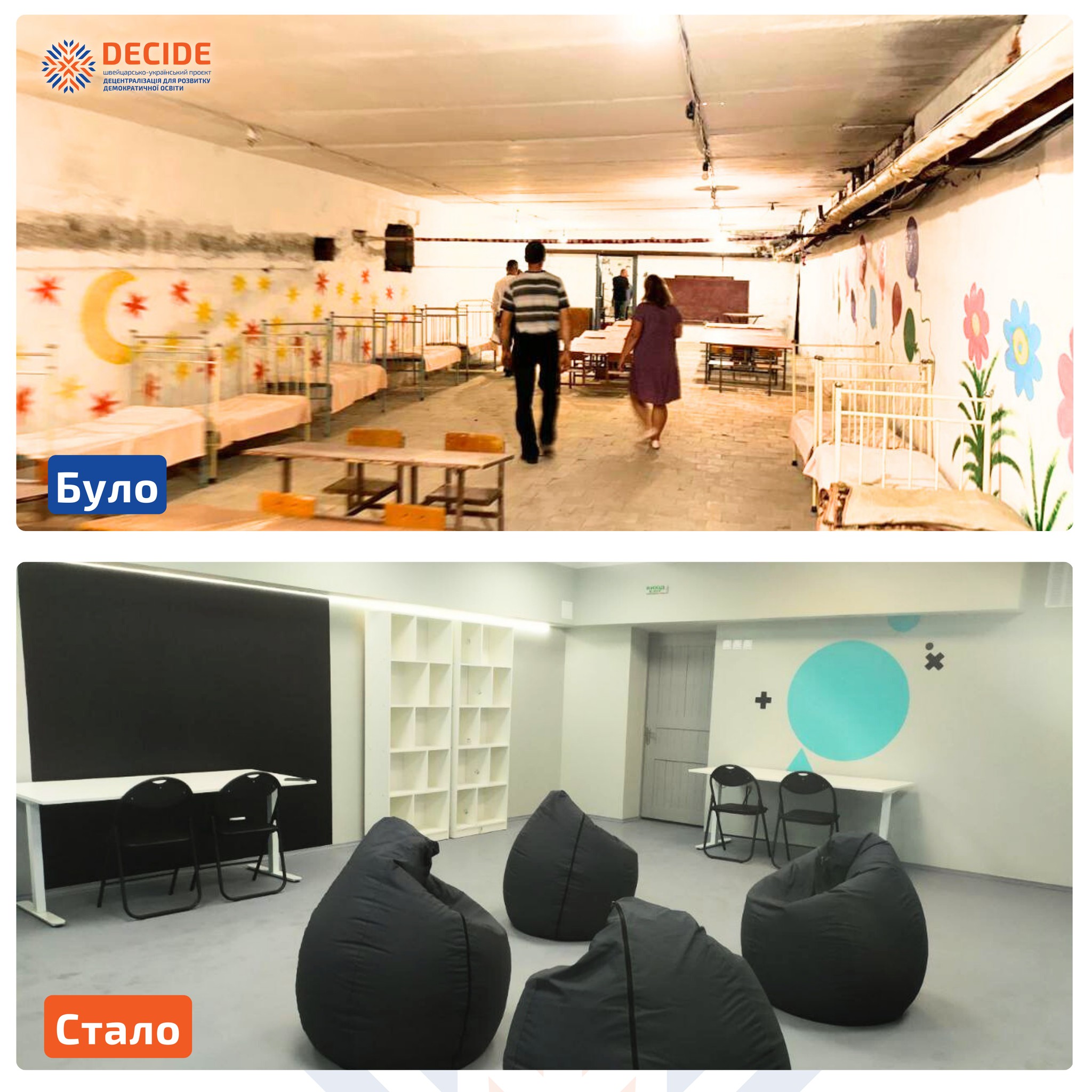 Завдяки ініціативі Швейцарсько-українського проєкту DECIDE «DECIDE: ВІДБУДОВА» це укриття перетворилося на справжній освітній хаб, де діти зможуть навчатися, відпочивати та навіть займатися спортом .